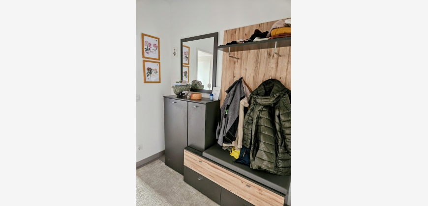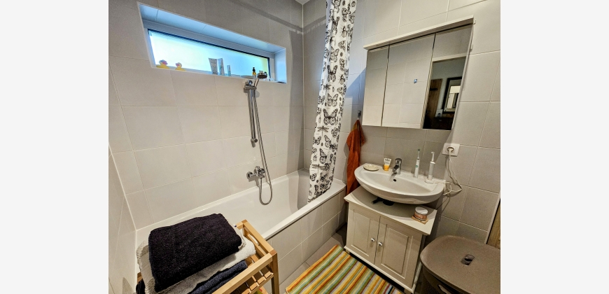 * Badezimmer: Waschmaschine, Heizkörper, Hochschrank, Waschtischunterschrank, massgefertigter Verbau über Waschmaschine mit 3 grossen Laden und grosser Abstellfläche (kann auch als Wickeltisch verwendet werden)