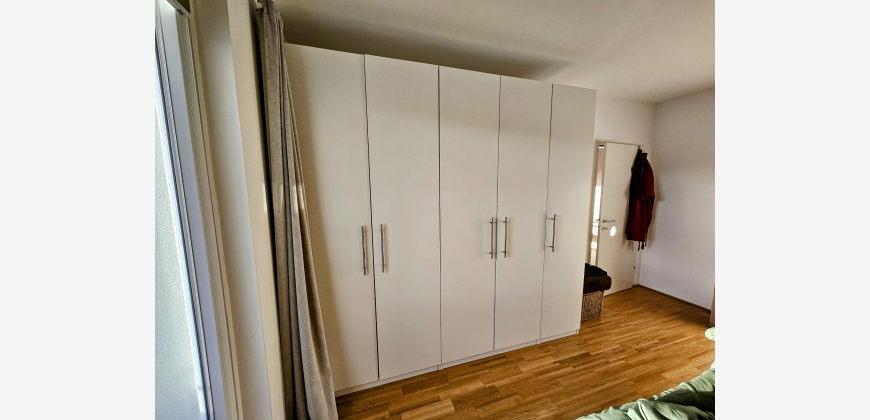 * Schlafzimmer: grauer Vorhang inkl. Vorhangstange, grosser Kleiderschrank, Jalousie, Zirbenbett aus Massivholz
