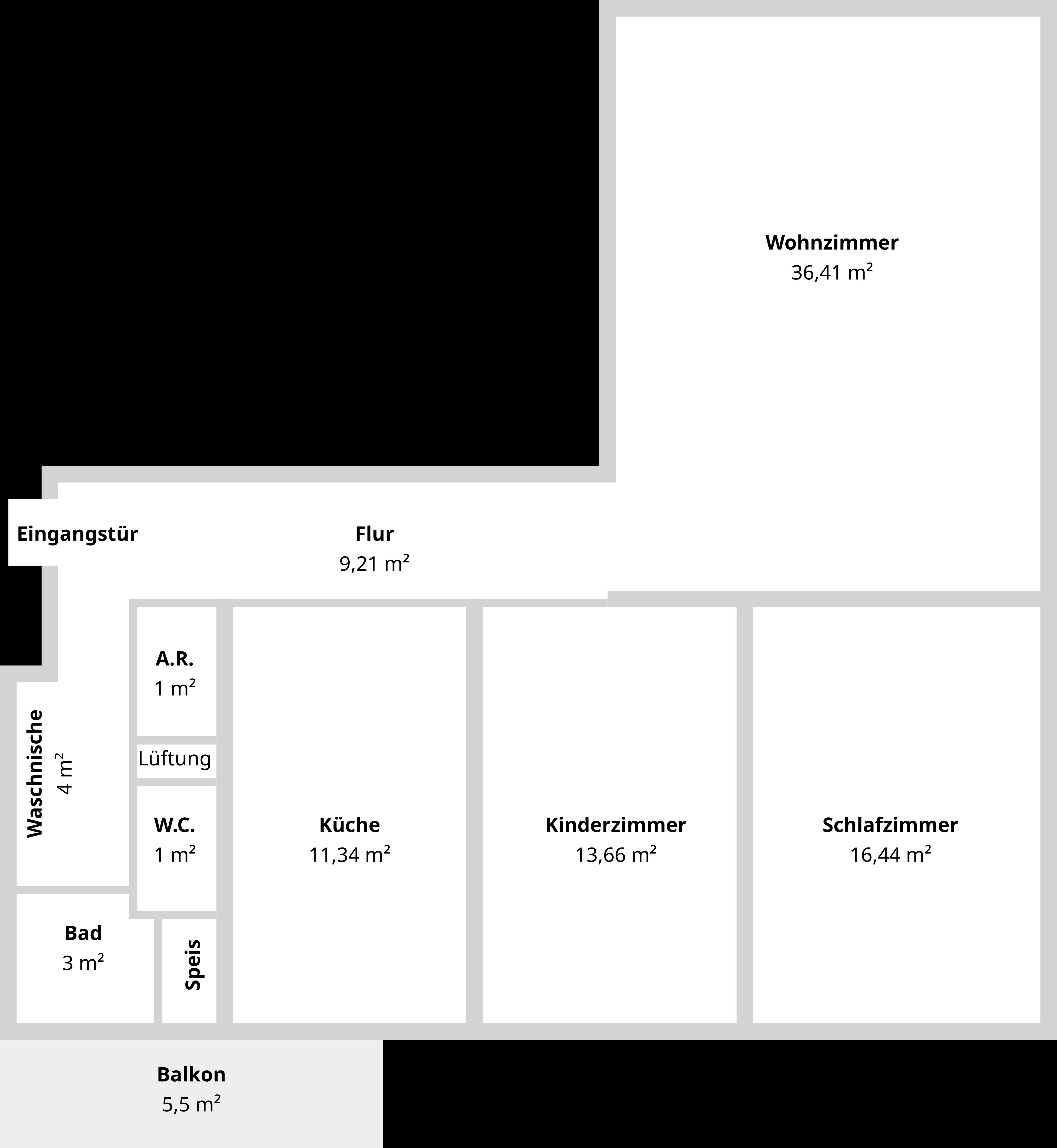 Die Wohnung verfügt über drei Zimmer (Schlafzimmer, Kinderzimmer und Wohnzimmer), Küche, getrenntes Bad und WC, Abstellraum, Speis, Wasch- bzw. Wirtschaftsnische sowie einen 5,5 m² großen Balkon. Zur Ausstattung gehören Parkettböden und eine Einbauküche. Die Beheizung erfolgt über Fernwärme. Zusätzlichen Stauraum bietet ein Kellerabteil. Das Gebäude ist mit zwei Aufzügen ausgestattet.