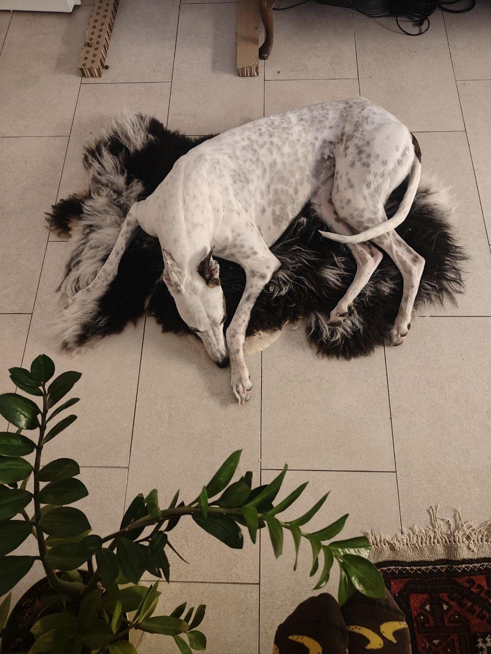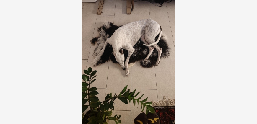 Meine 3-jährige Greyhoundhündin “Poppy” wohnt mit mir in der Wohnung. Sie ist unkompliziert und brav, mit fremden Personen etwas schüchtern, hat sie dich einmal in ihr Herz geschlossen ist sie jedoch sehr liebevoll und anhänglich.