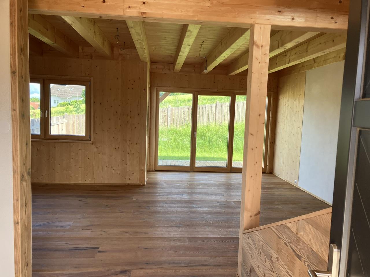 Damit man überhaupt das Wohlfühlklima „Holz“ auch spüren kann, benötigt man bei den Holzwänden eine Mindestwandstärke von 10 cm. Unsere Außenwände wurden aus 12 cm Vollholz gebaut und in den Innenräumen die Zwischenwände mit Holzwolle gedämmt und mit Lehm verputzt.