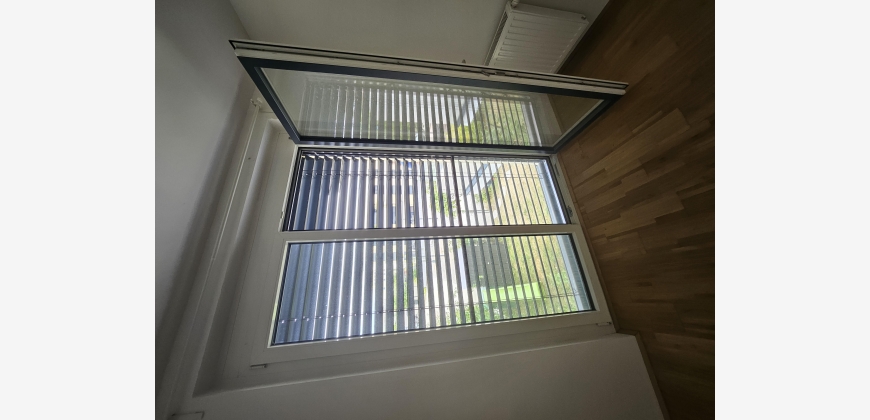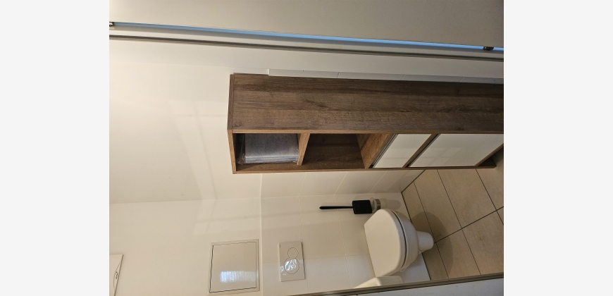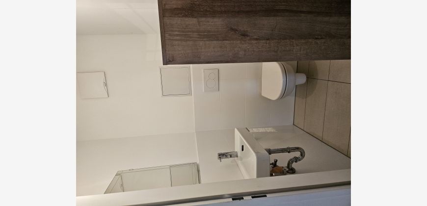 Wohnzimmer mit integrierter Küche, Schlafzimmer (französisches Fenster), Abstellraum, Bad und WC