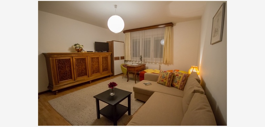 Die Wohnung befindet sich in einem Wohnhaus mit Lift und verfügt über einen sonnigen Balkon, auf dem sich sowohl der Morgenkaffee als auch der Sonnenuntergang mit Blick in die Berge genießen lässt.