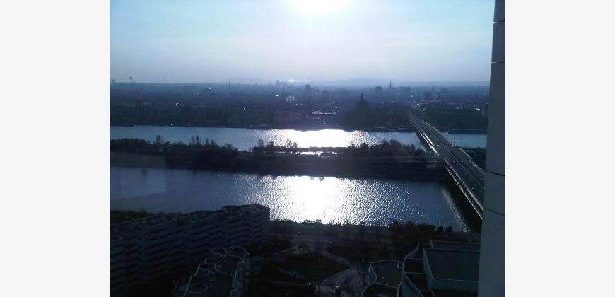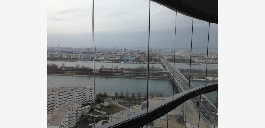 Sie befindet sich im 21. Stock mit toller Aussicht über Wien.