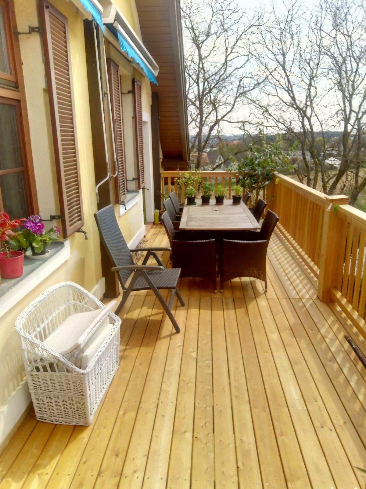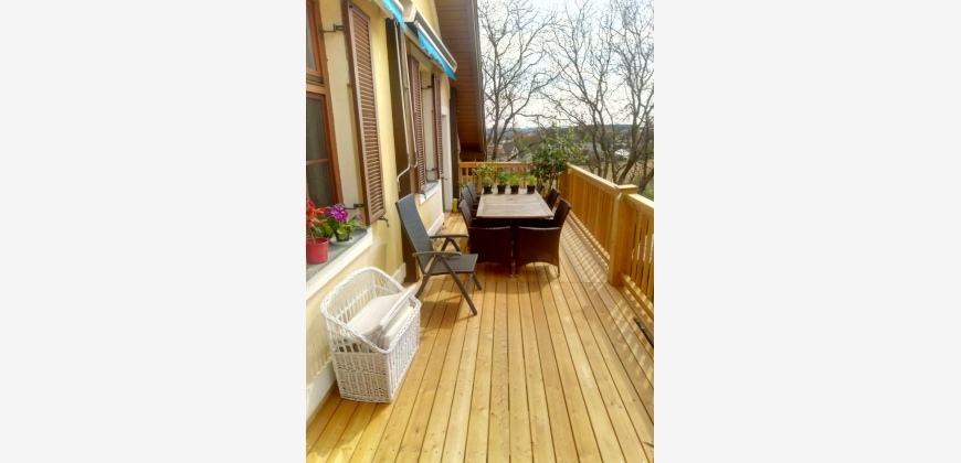Von der Küche (bzw. auch vom Wohnzimmer) kann man an den wunderschönen, riesigen, neugebauten Süd-West-ausgerichteten Lärchenbalkon gelangen, mit 2 verstellbaren Markisen.