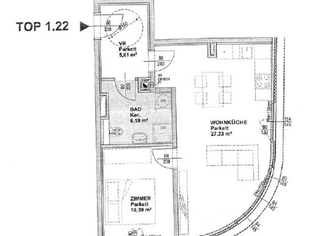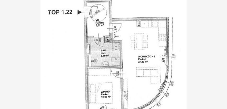 Die Wohnung befindet sich im 4. Liftstock (rollstuhlgerecht mit Lift), hat eine Wohnfläche von 49,42 m² und ist in Vorzimmer, Wohnküche mit Markengeräten, Schlafzimmer und ein Badezimmer mit leicht zugänglicher Dusche und Toilette eingeteilt. Zur Wohnung gehört auch ein Kellerabteil mit 1,00 m².