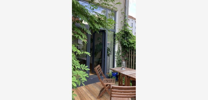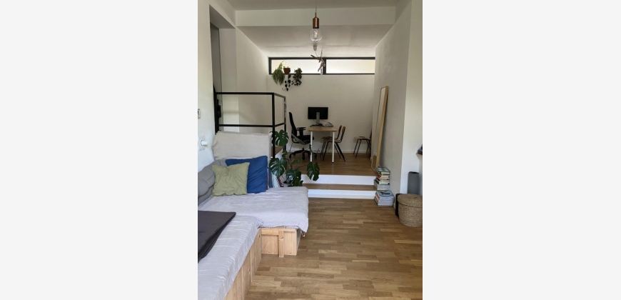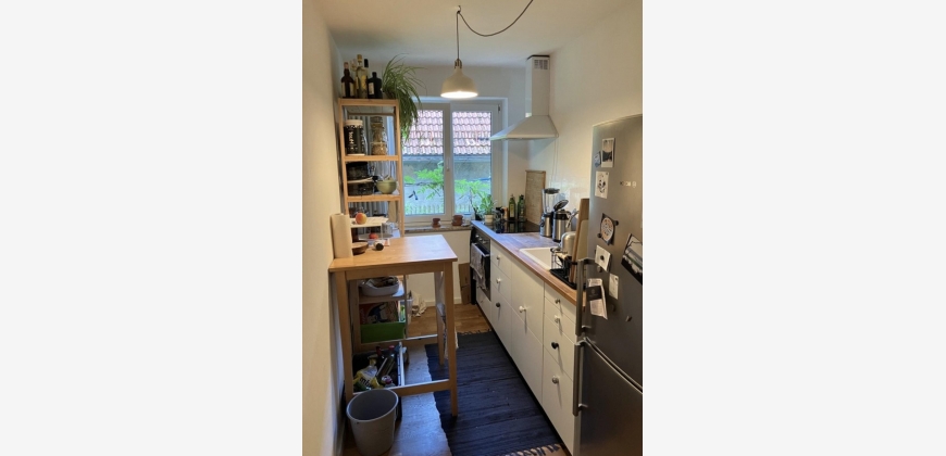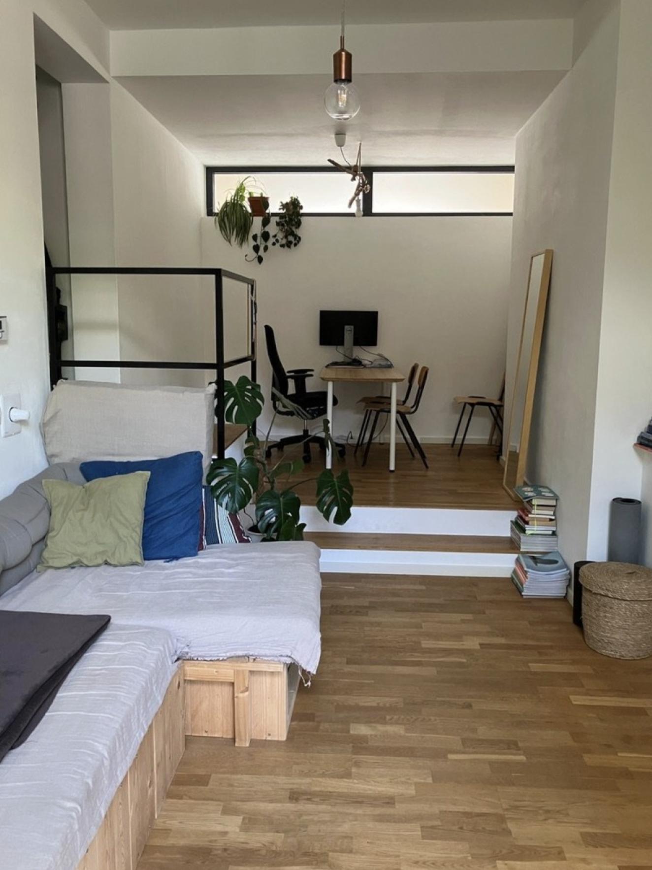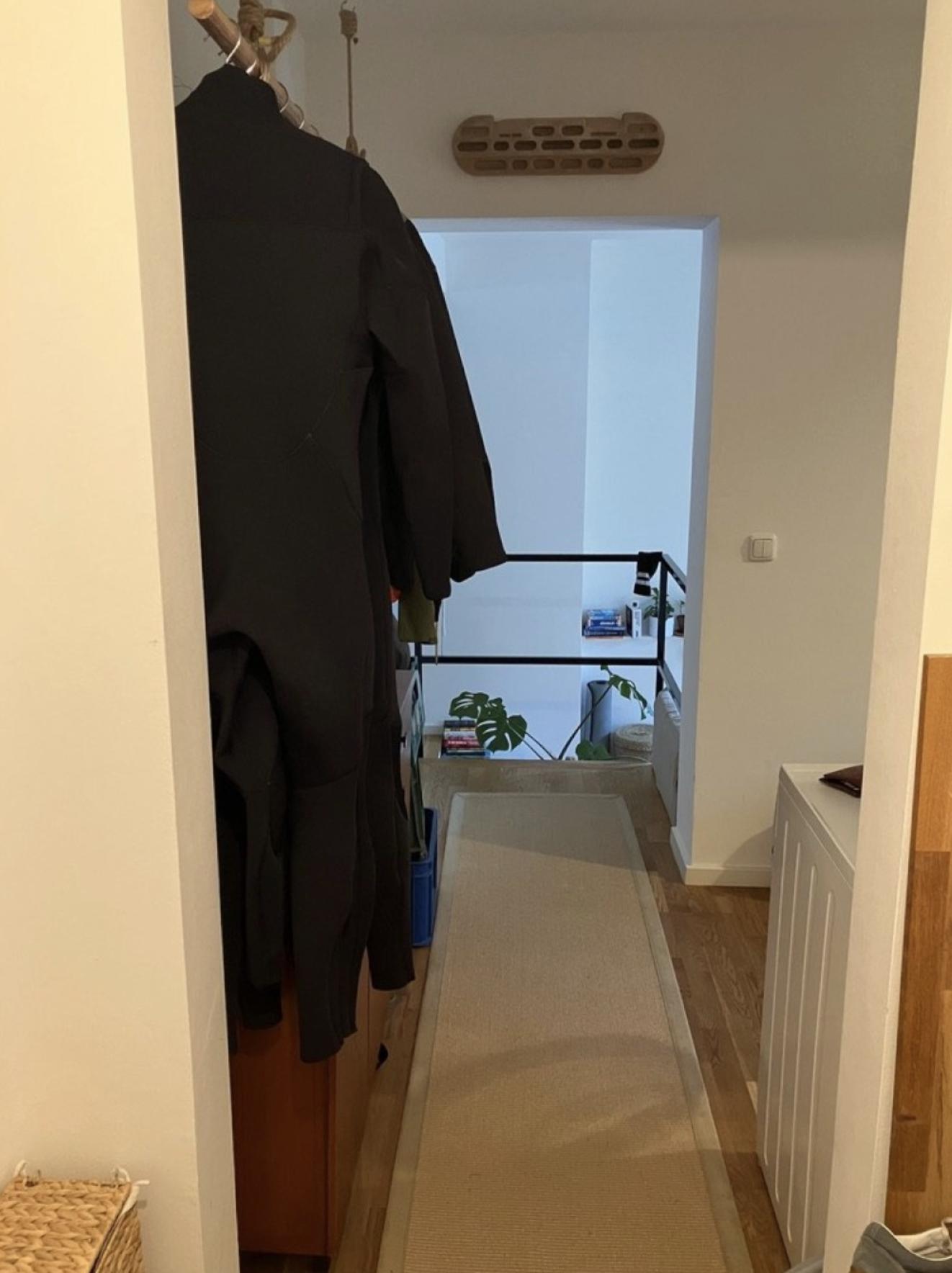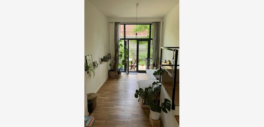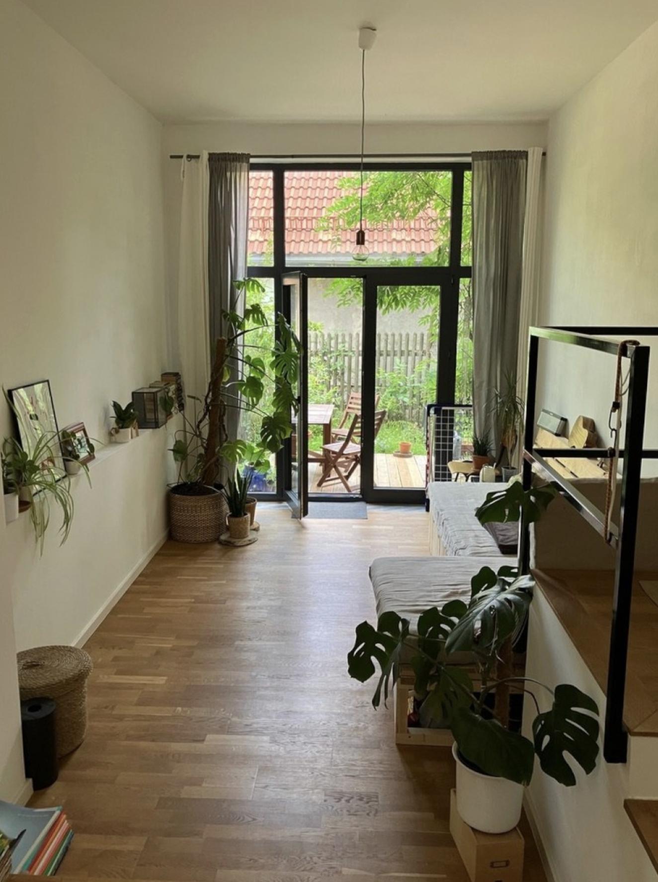Die Wohnung hat ein Wohnzimmer und ein Schlafzimmer und genug Stauraum. Der Flur verbindet alle Zimmer und führt in das große Wohnzimmer. Dieses besitzt 4m hohe Decken und Zugang zu einem kleinen Garten auf dem man vormittags in der Sonne sitzen kann. Bad (mit Badewanne) und Küche haben alles was man zum Wohnen benötigt.