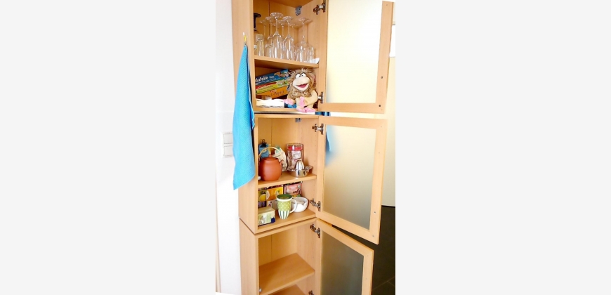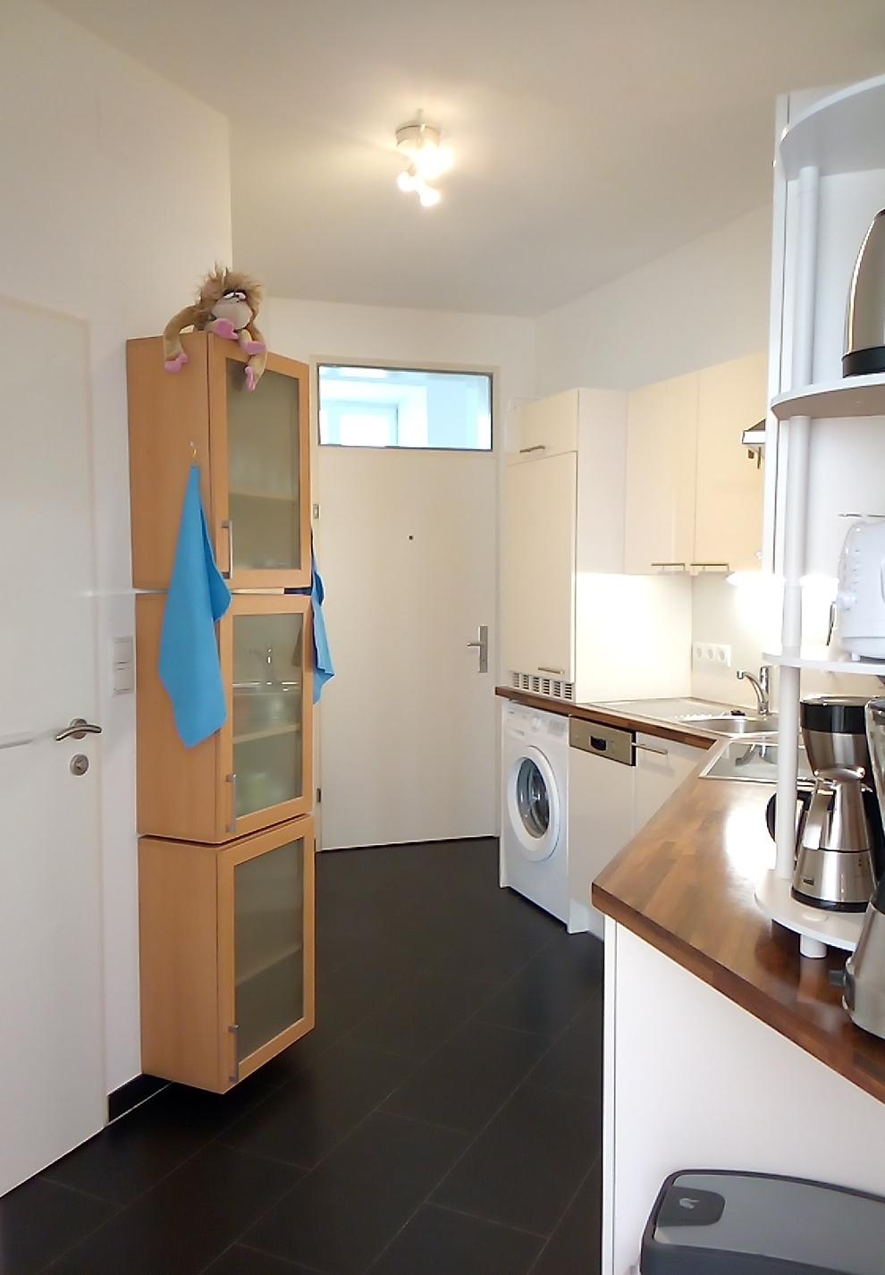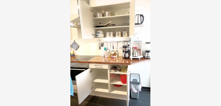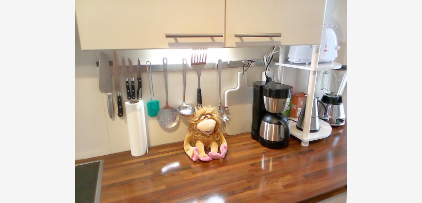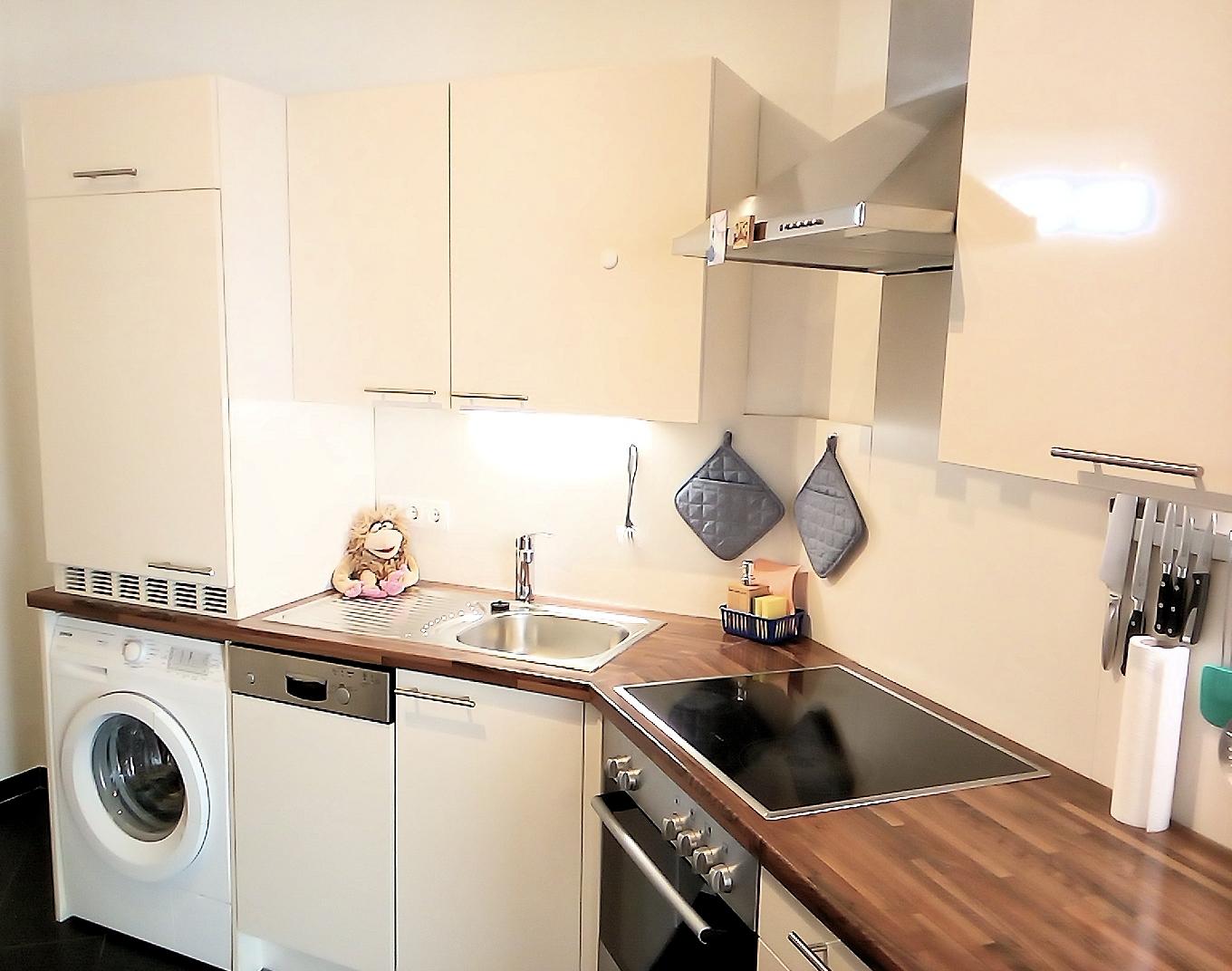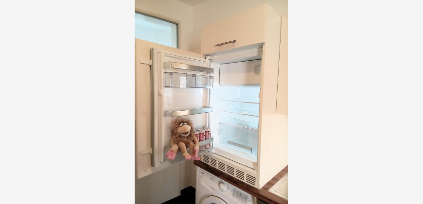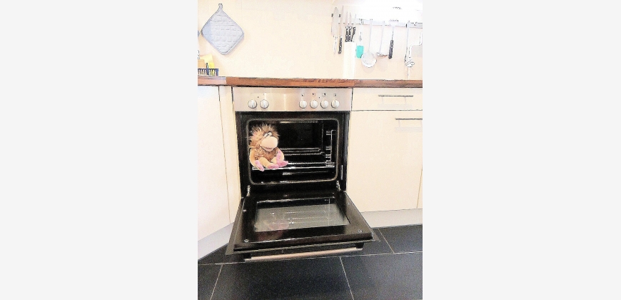 Vorzimmer und maßgeschneiderte EWE-Komplettküche mit Herd (Ceranfeld, Backrohr, Dunstabzug), Kühlschrank mit Gefrierfach, Geschirrspüler, Waschmaschine, allen Utensilien wie Geschirr, Besteck, Gläser, Toaster, Töpfe, Pfannen, Wasserkocher, zwei verschiedene Kaffeemaschinen etc.