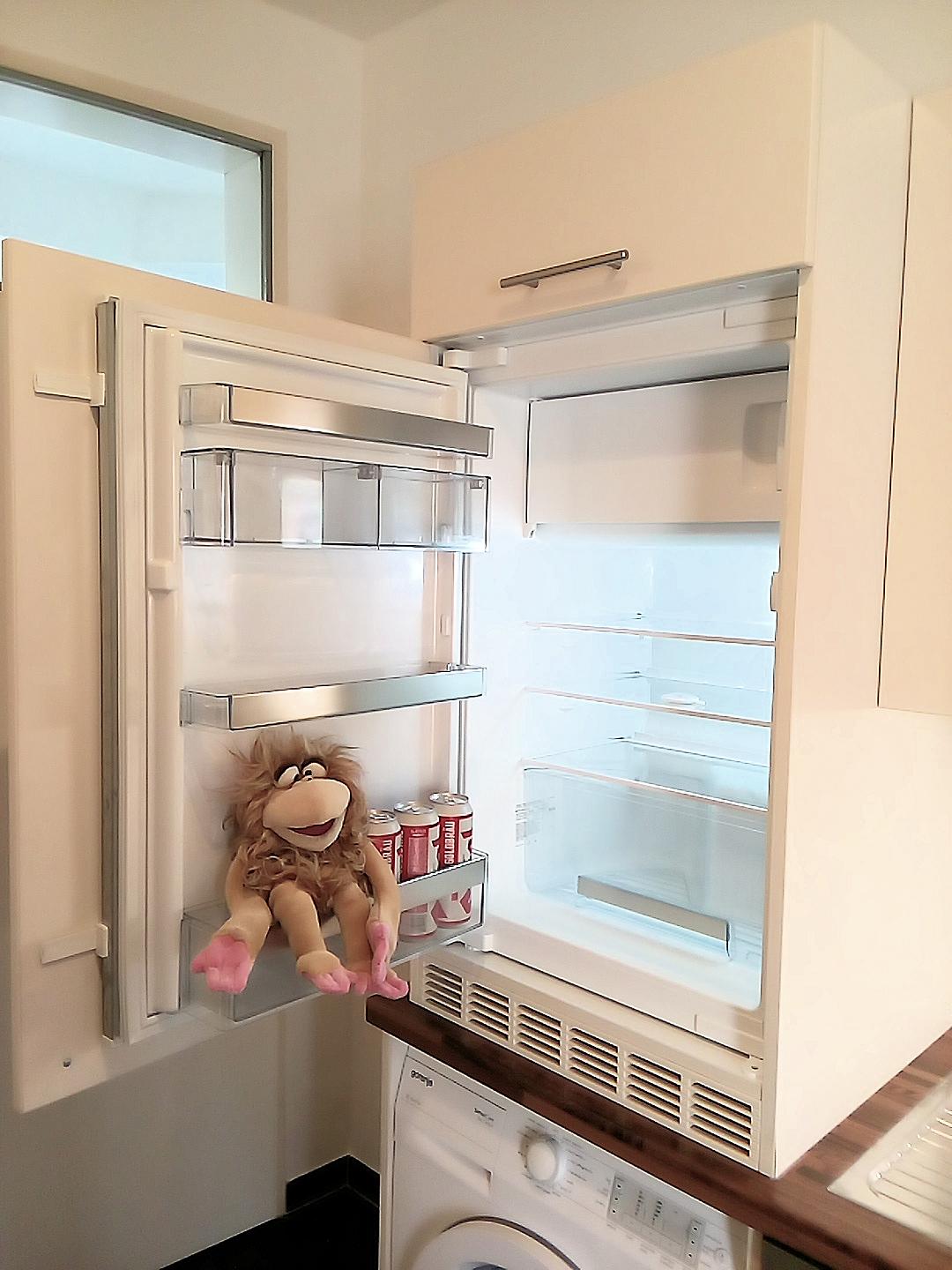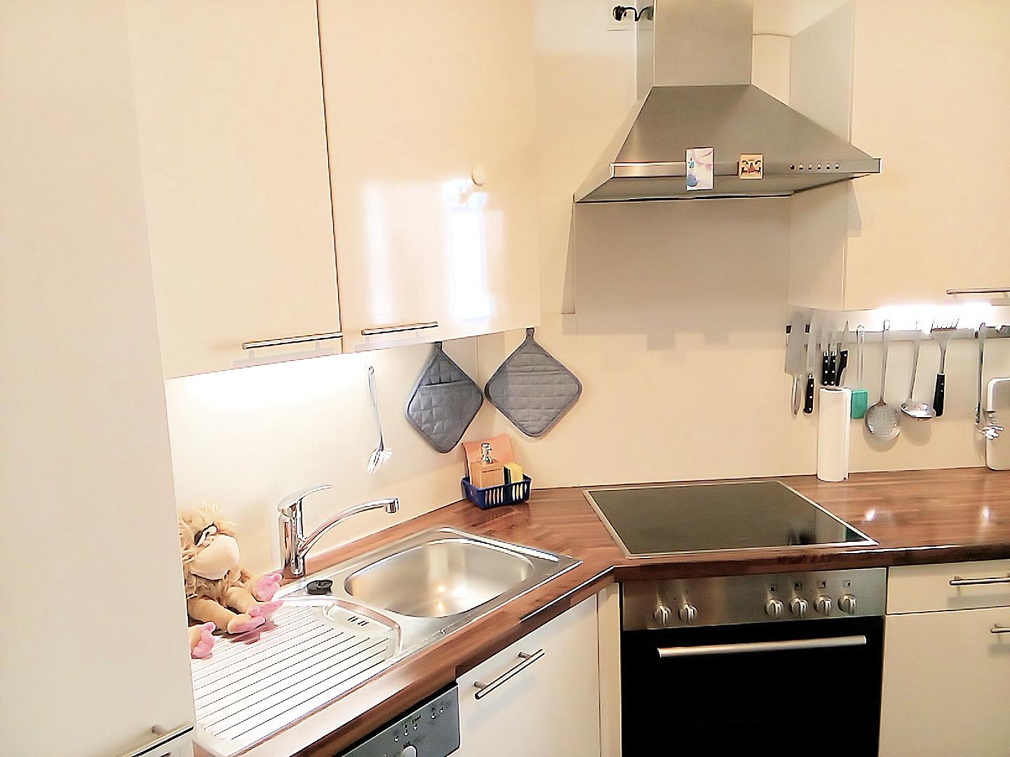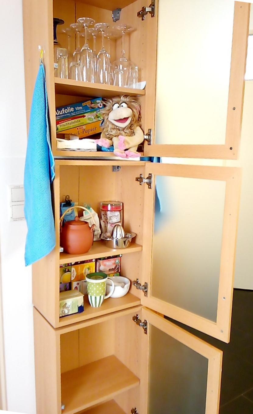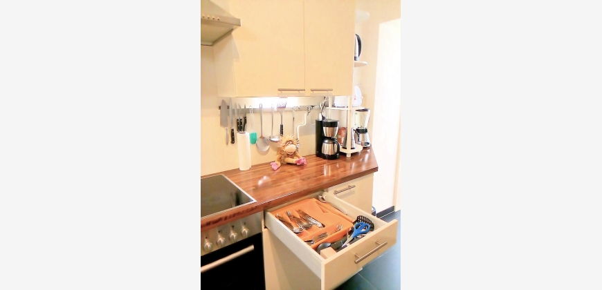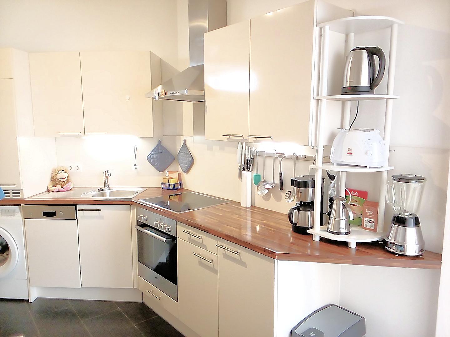 Vorzimmer und maßgeschneiderte EWE-Komplettküche mit Herd (Ceranfeld, Backrohr, Dunstabzug), Kühlschrank mit Gefrierfach, Geschirrspüler, Waschmaschine, allen Utensilien wie Geschirr, Besteck, Gläser, Toaster, Töpfe, Pfannen, Wasserkocher, zwei verschiedene Kaffeemaschinen etc.
