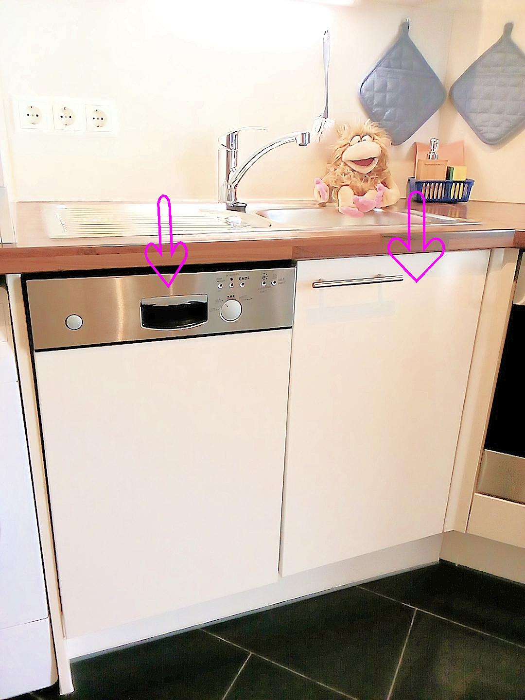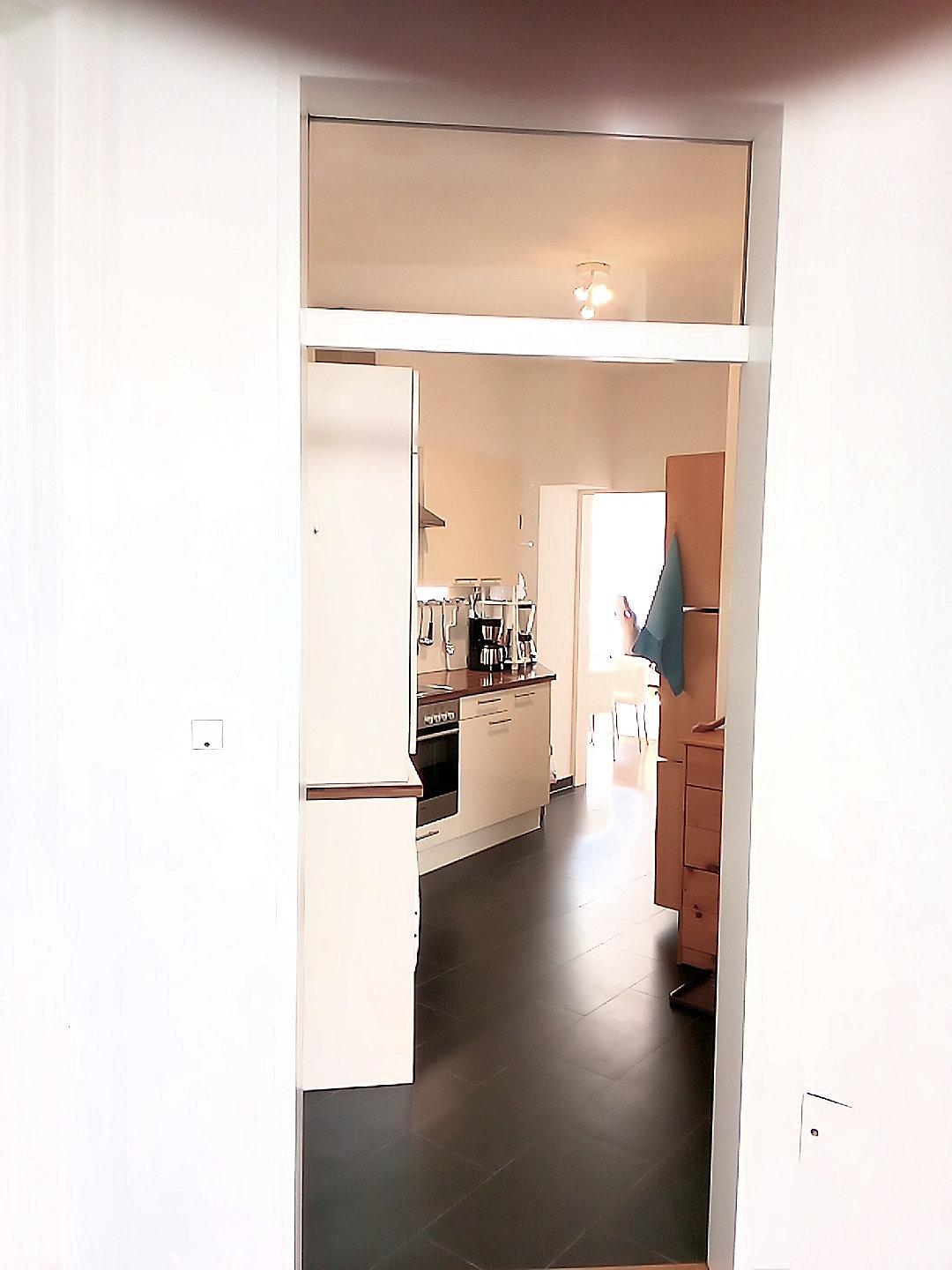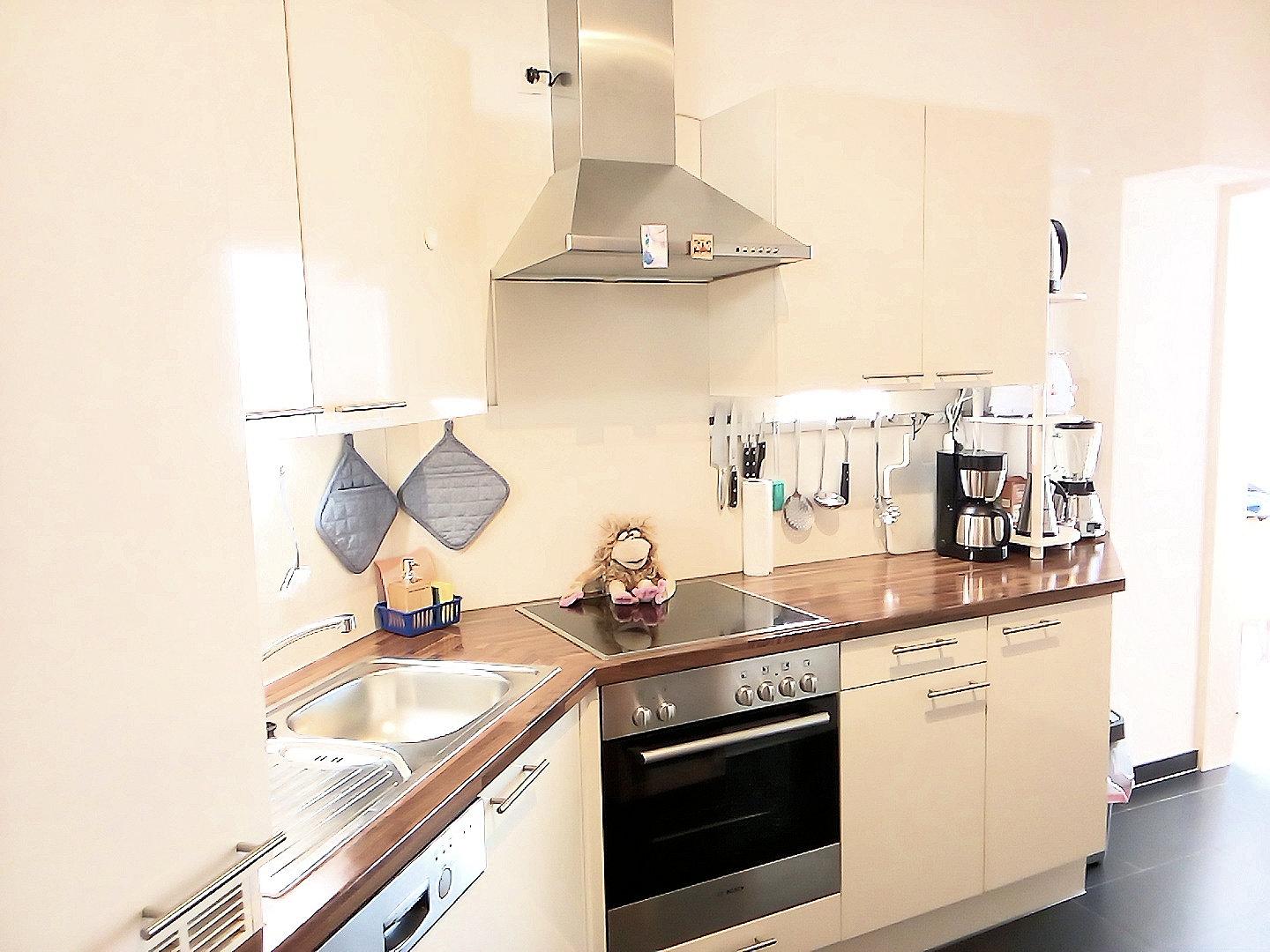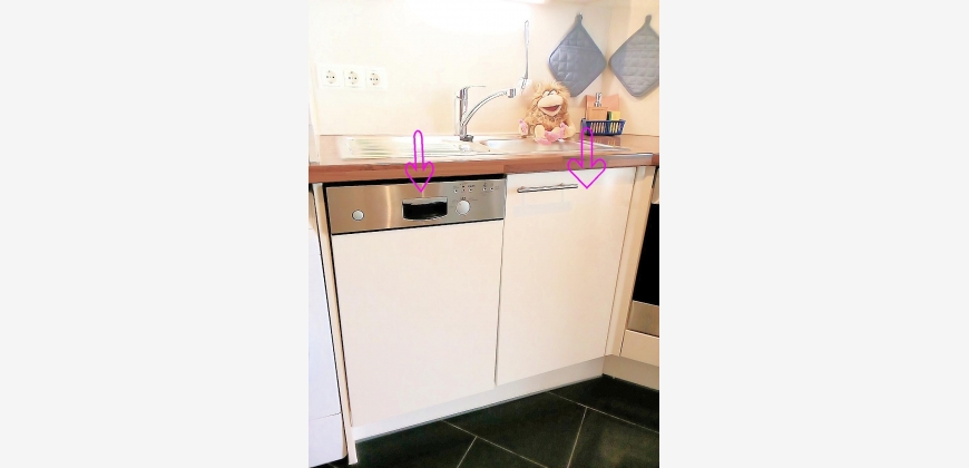 Vorzimmer und maßgeschneiderte EWE-Komplettküche mit Herd (Ceranfeld, Backrohr, Dunstabzug), Kühlschrank mit Gefrierfach, Geschirrspüler, Waschmaschine, allen Utensilien wie Geschirr, Besteck, Gläser, Toaster, Töpfe, Pfannen, Wasserkocher, zwei verschiedene Kaffeemaschinen etc.
