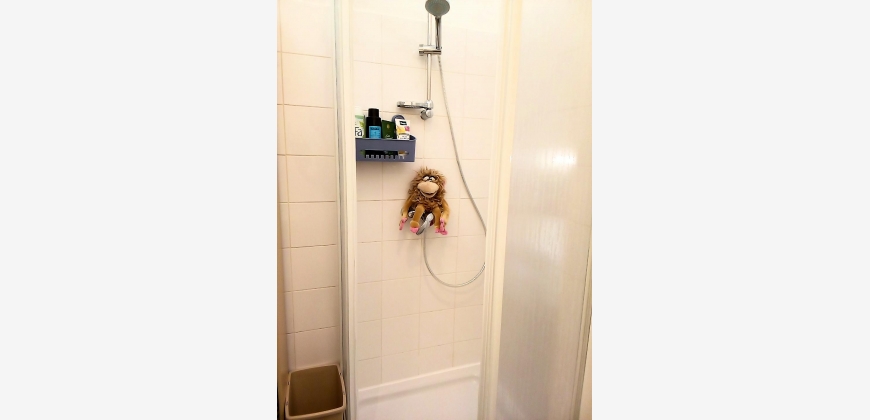 • Badezimmer mit Dusche, Waschbecken, Handtuchtrocknerheizung