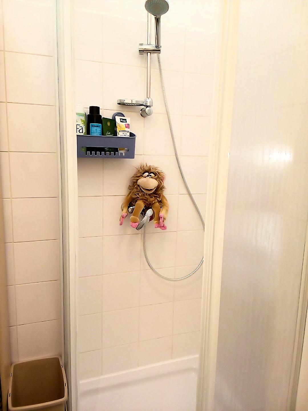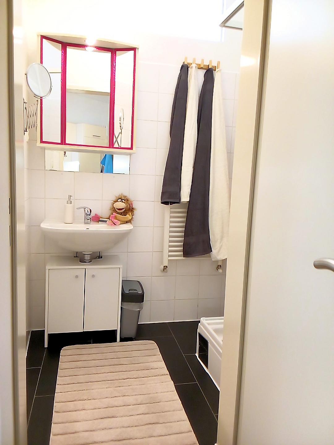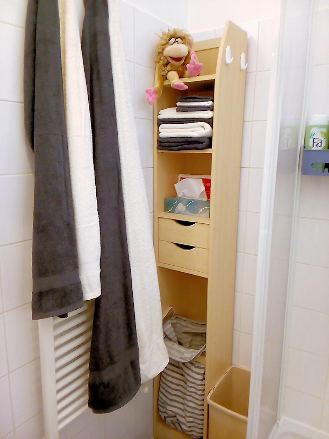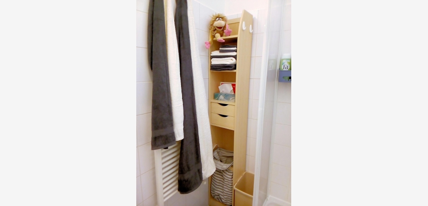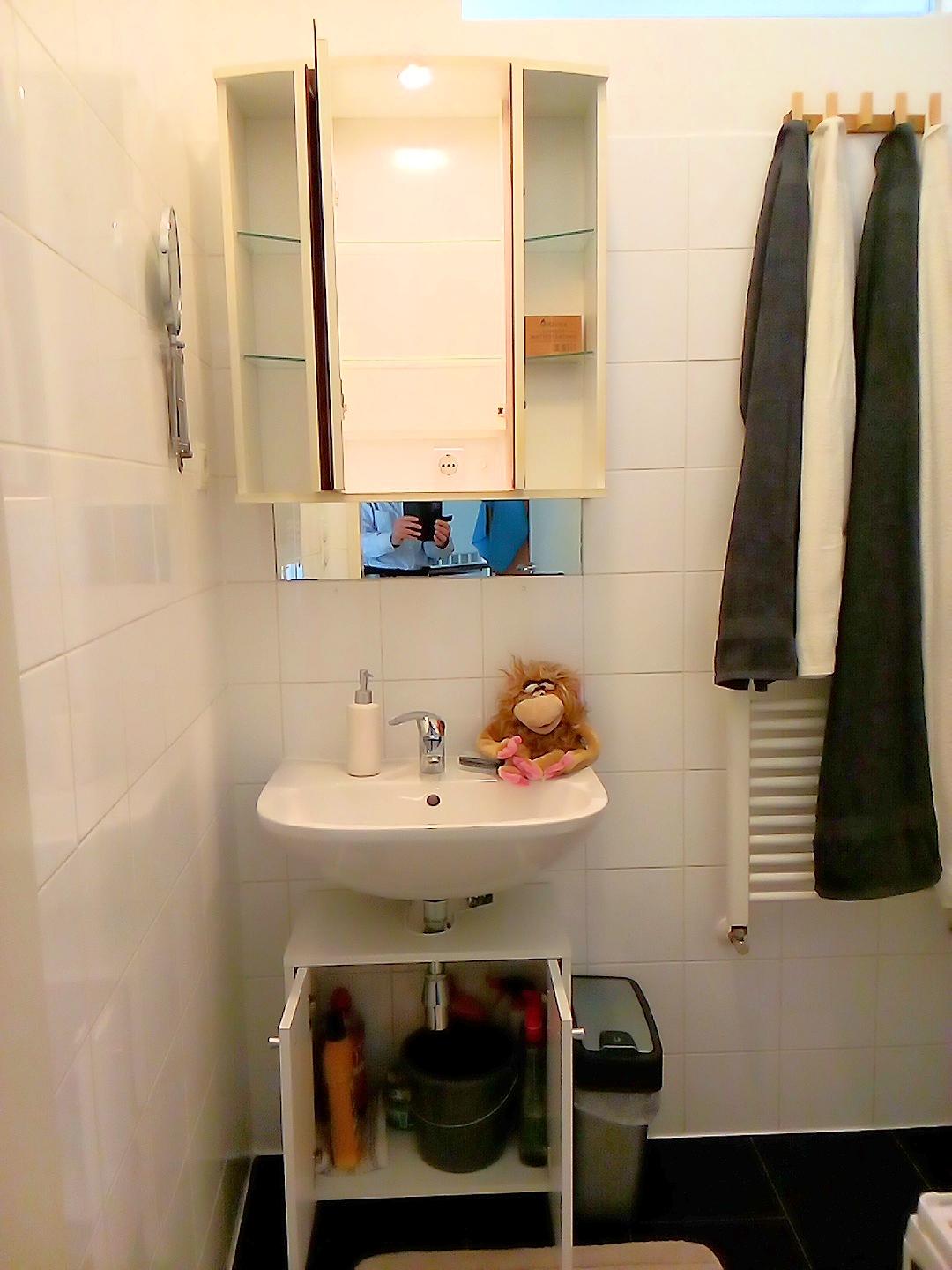 Badezimmer mit Dusche, Ventilatorabzug, Spiegelschrank mit integrierter Beleuchtung, Waschbecken, Unterschrank, Hochschrank für Schmutzwäsche und anderen Utensilien, Handtücher, Bodenmatte