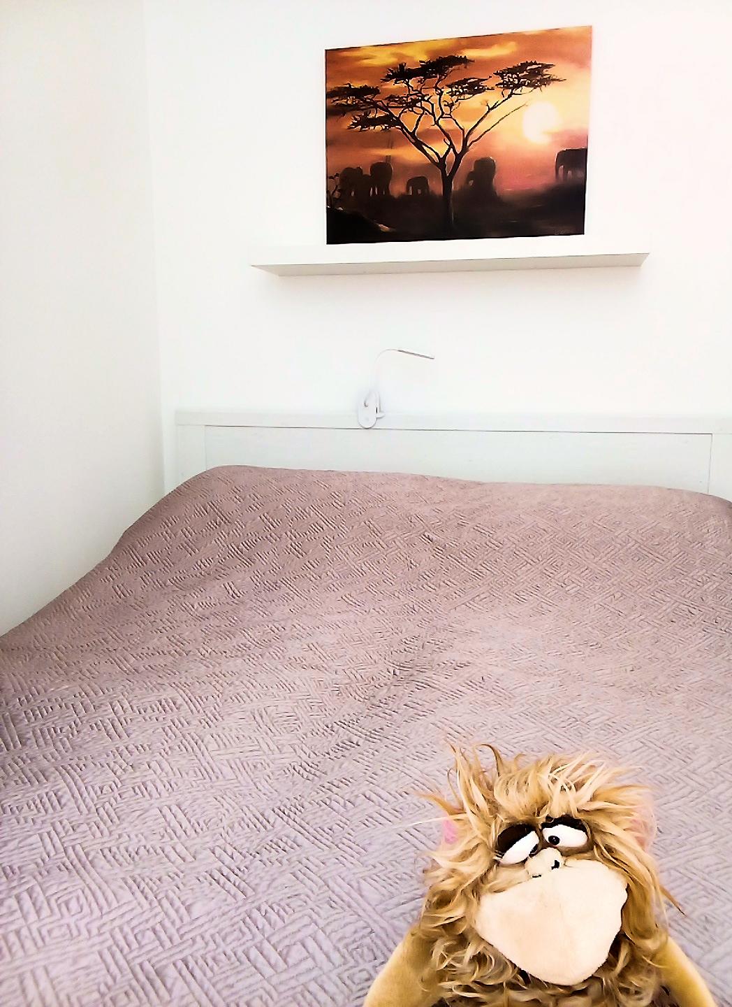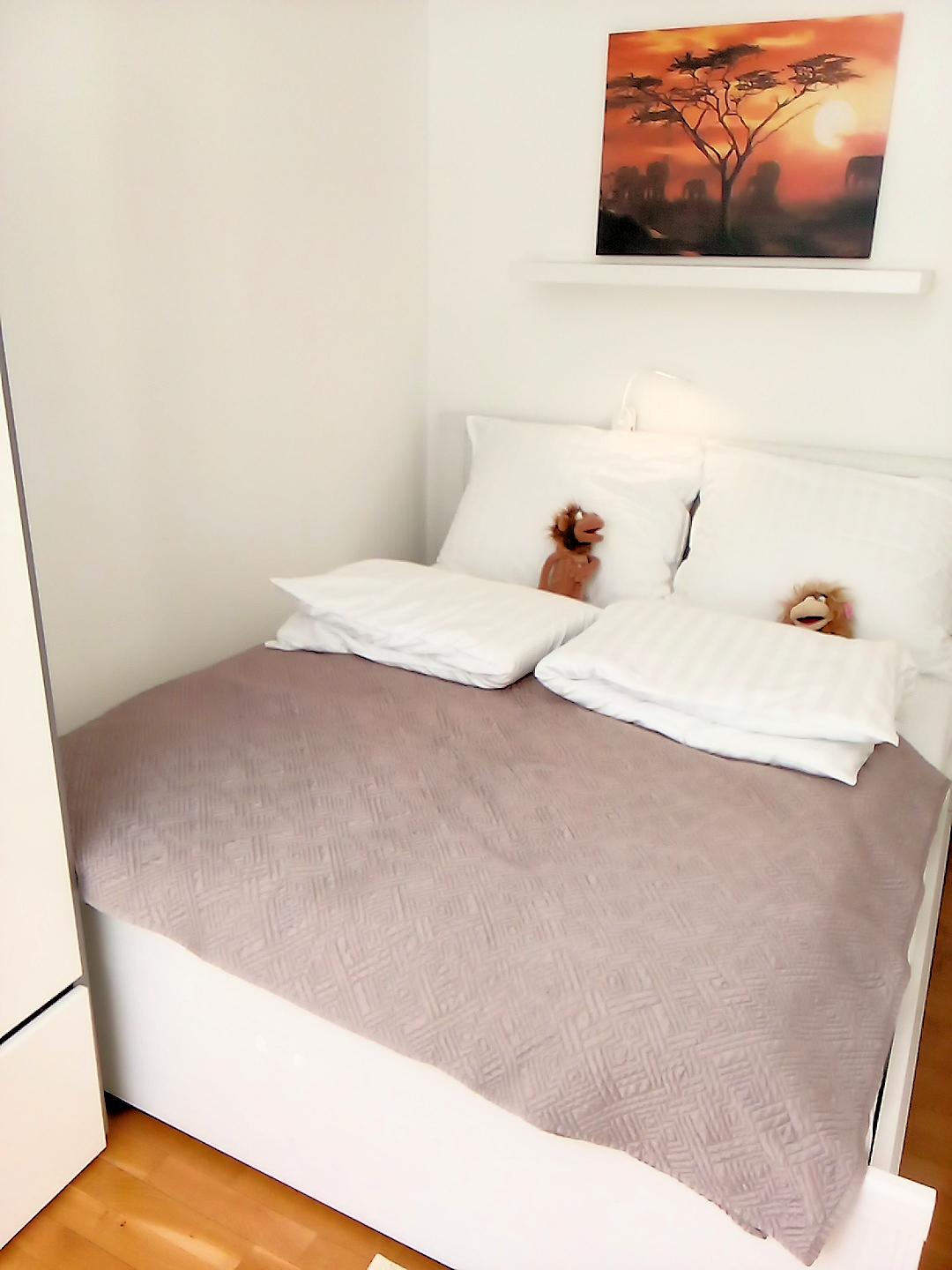 Schlafzimmer mit Queensize-Bett (160x200cm), Luxusmatratze mit Härtegrad 2 oder 3 (je eine Seite der Matratze), 2 Polster, 2 Bettdecken, 2x2 Garnituren Bettwäsche, Kasten mit 20 Kleiderbügeln und vielen Fächern und Laden, Innenrollos und Vorhänge