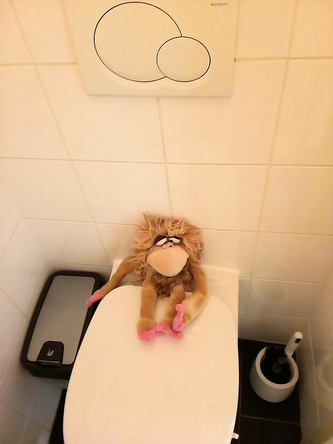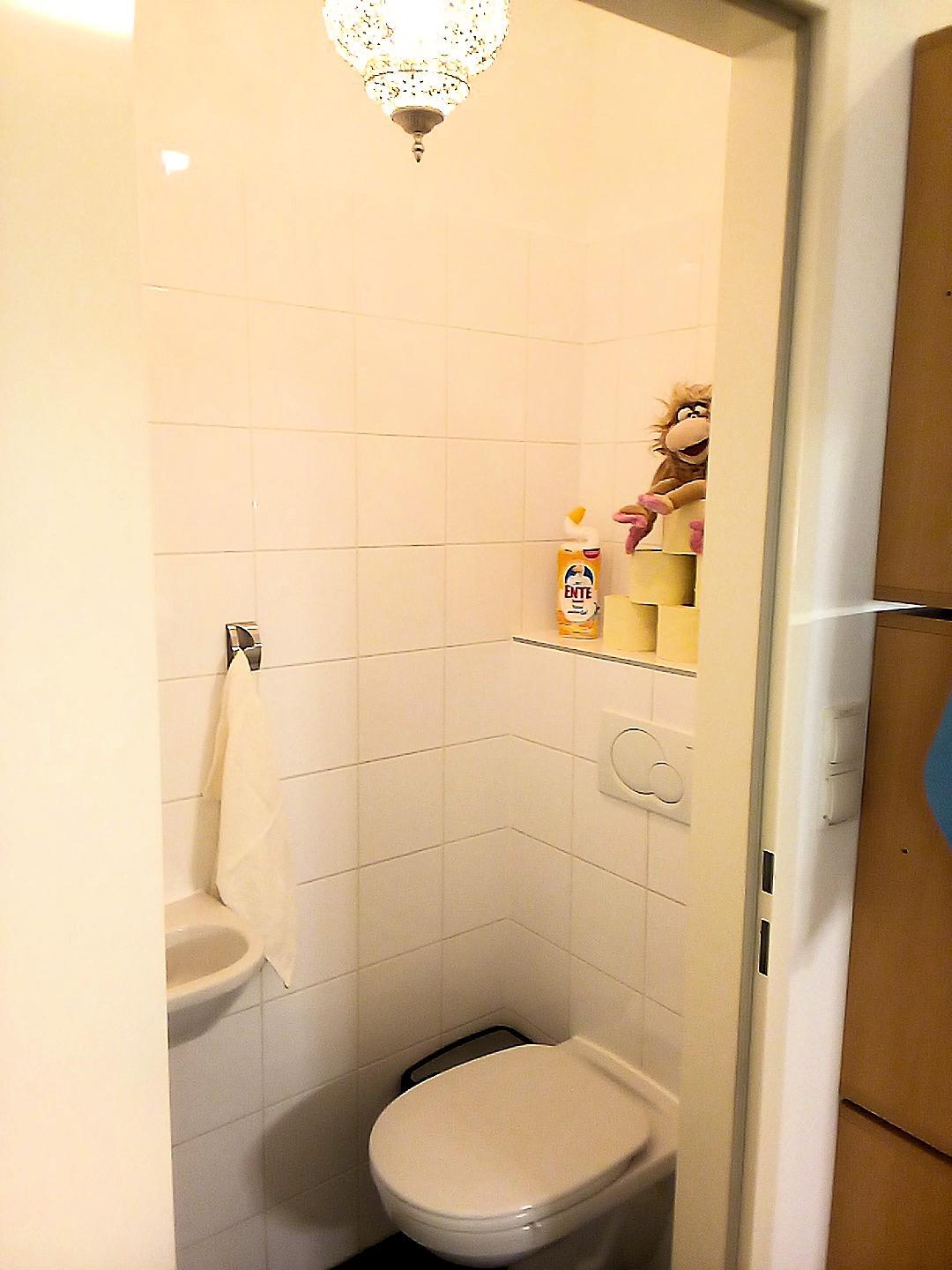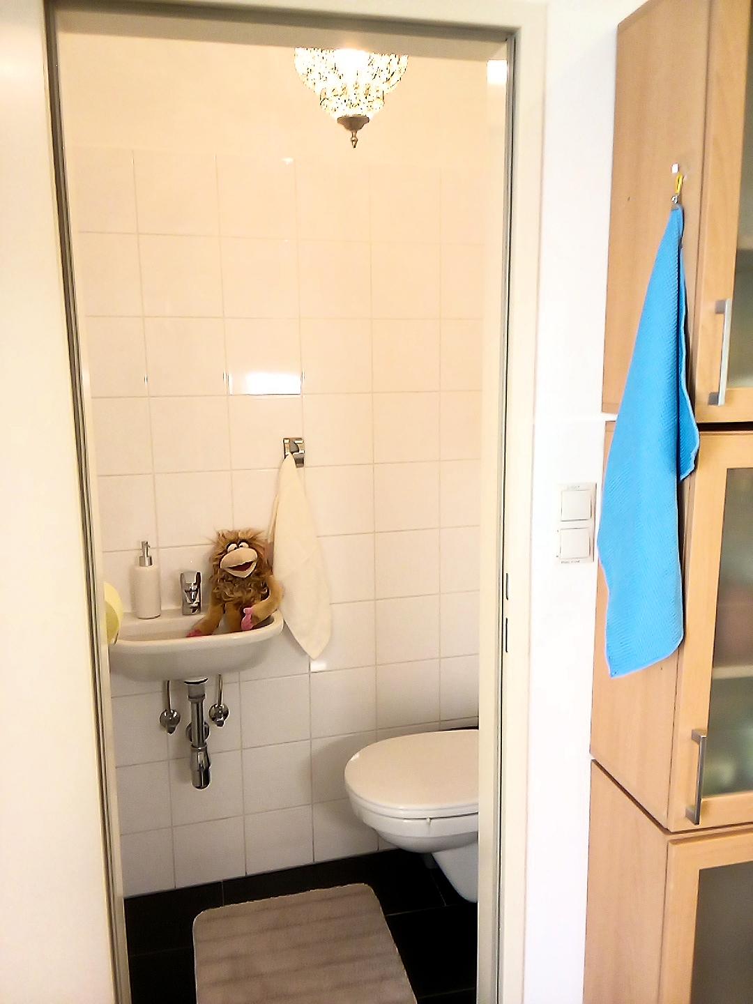 WC separat mit Waschbecken, Handtücher, Bodenmatte und Ventilatorabzug