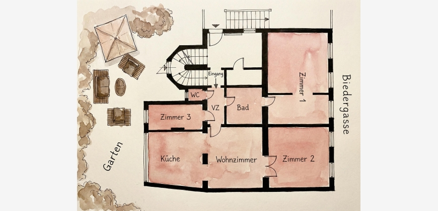 Zimmer 3 (siehe Plan) ist zu vergeben. Das Zimmer hat 10m² und besitzt ein Fenster zum Garten.