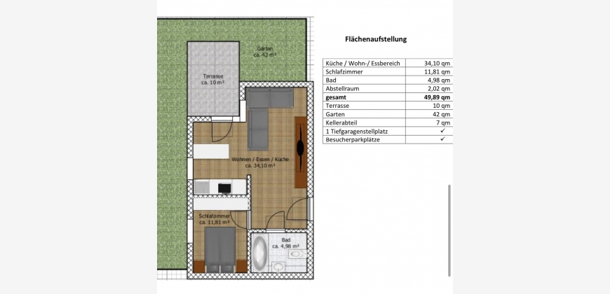 Im EG liegt diese freundliche Wohnung, die zum 01.07.2024 bezogen werden kann. Zu dem Objekt zählen zwei einladende Zimmer. Ein Schlafzimmer und ein großes, helles Wohnzimmer mit neuwertiger Küche. Durch den dazugehörigen Tiefgaragen-Stellplatz finden Sie stets einen Parkplatz. Auch ein Kellerraum ist vorhanden und bietet weiteren Stauraum.