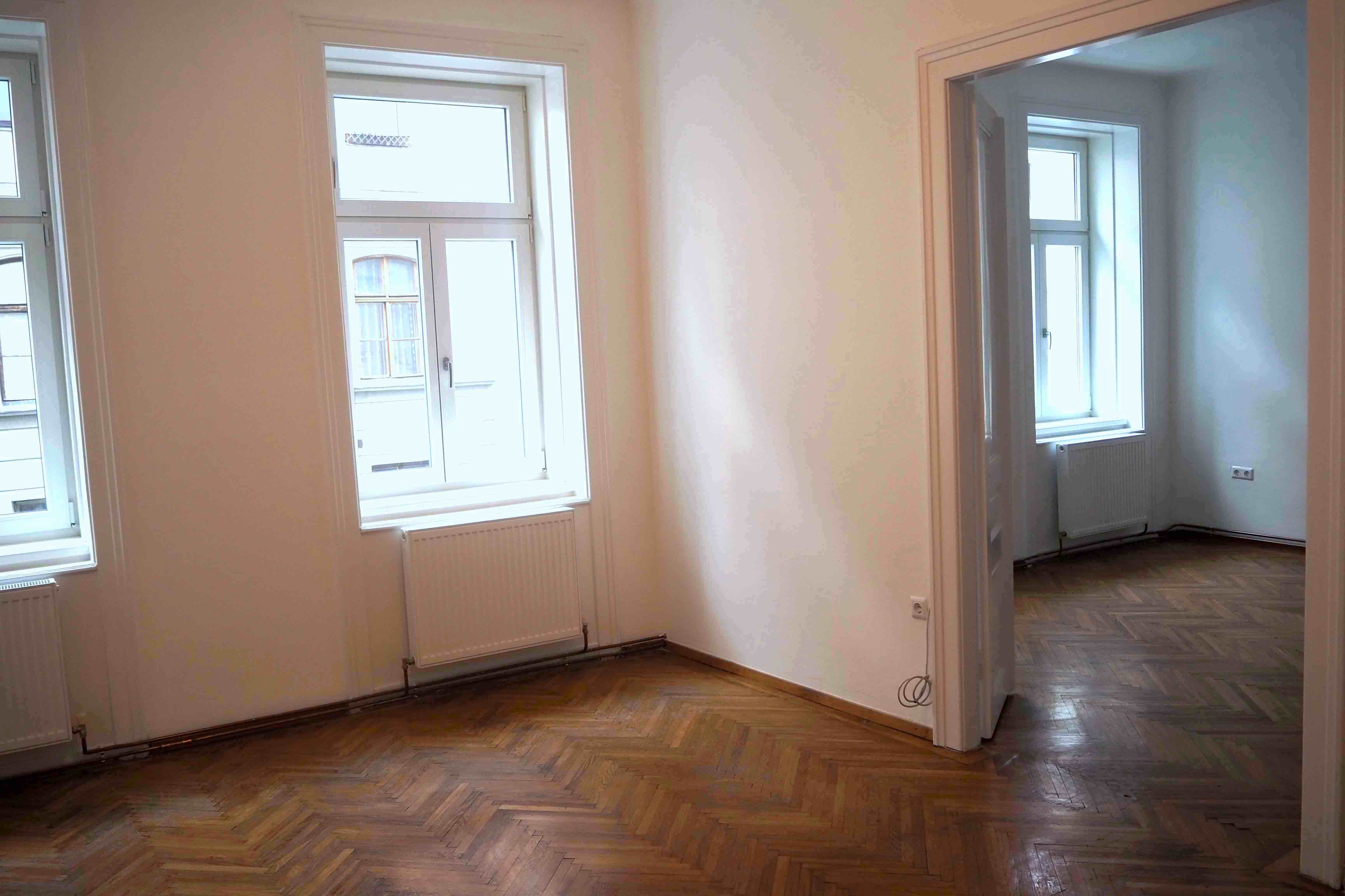 2 ca. 20 m² große, getrennt begehbare Zimmer, Küche, Vorraum, Abstellraum, Bad und separates WC. Die Wohnung befindet sich im 1. Stock (ohne Lift dafür mit viel Licht), ist ein Altbau und wurde generalsaniert. Im Badezimmer wurde lediglich die Therme erneuert und ein neuer Heizkörper installiert.
