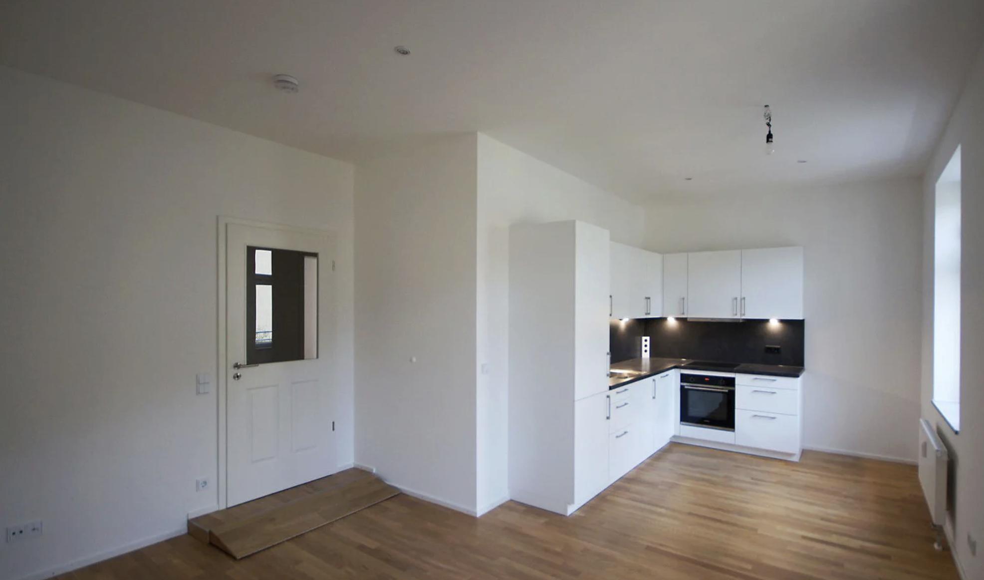 Mit einer typischen Altbau-Deckenhöhe von etwa 2,80 m bietet die Wohnung einen offenen Wohnbereich mit integrierter Küche. Die stilvolle, schwarz-weiße Einbauküche ist mit hochwertigen Siemens-Elektrogeräten ausgestattet und lässt keine Wünsche offen.
