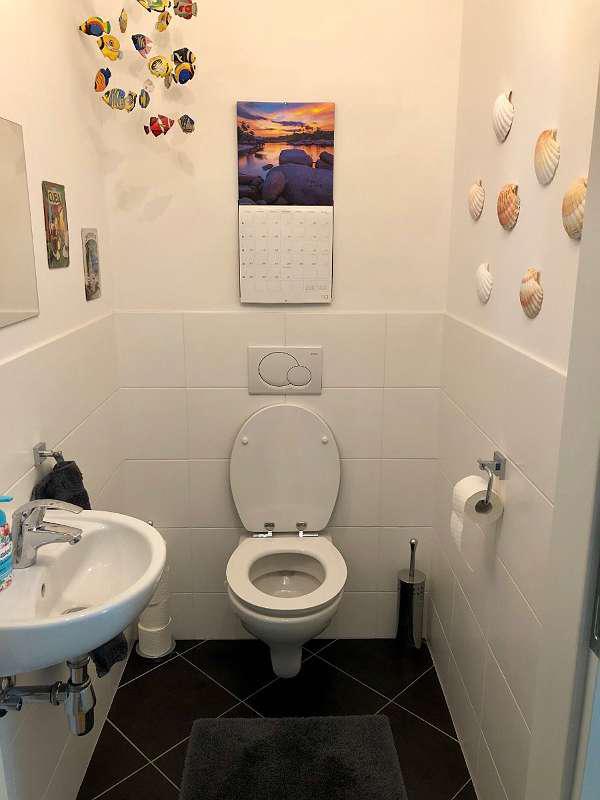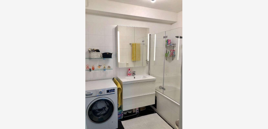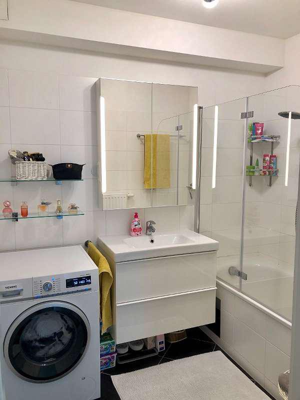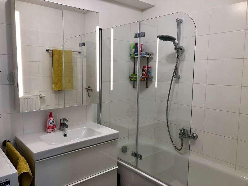 Bad mit Waschmaschine, Wannenbad und Duschtrennwand