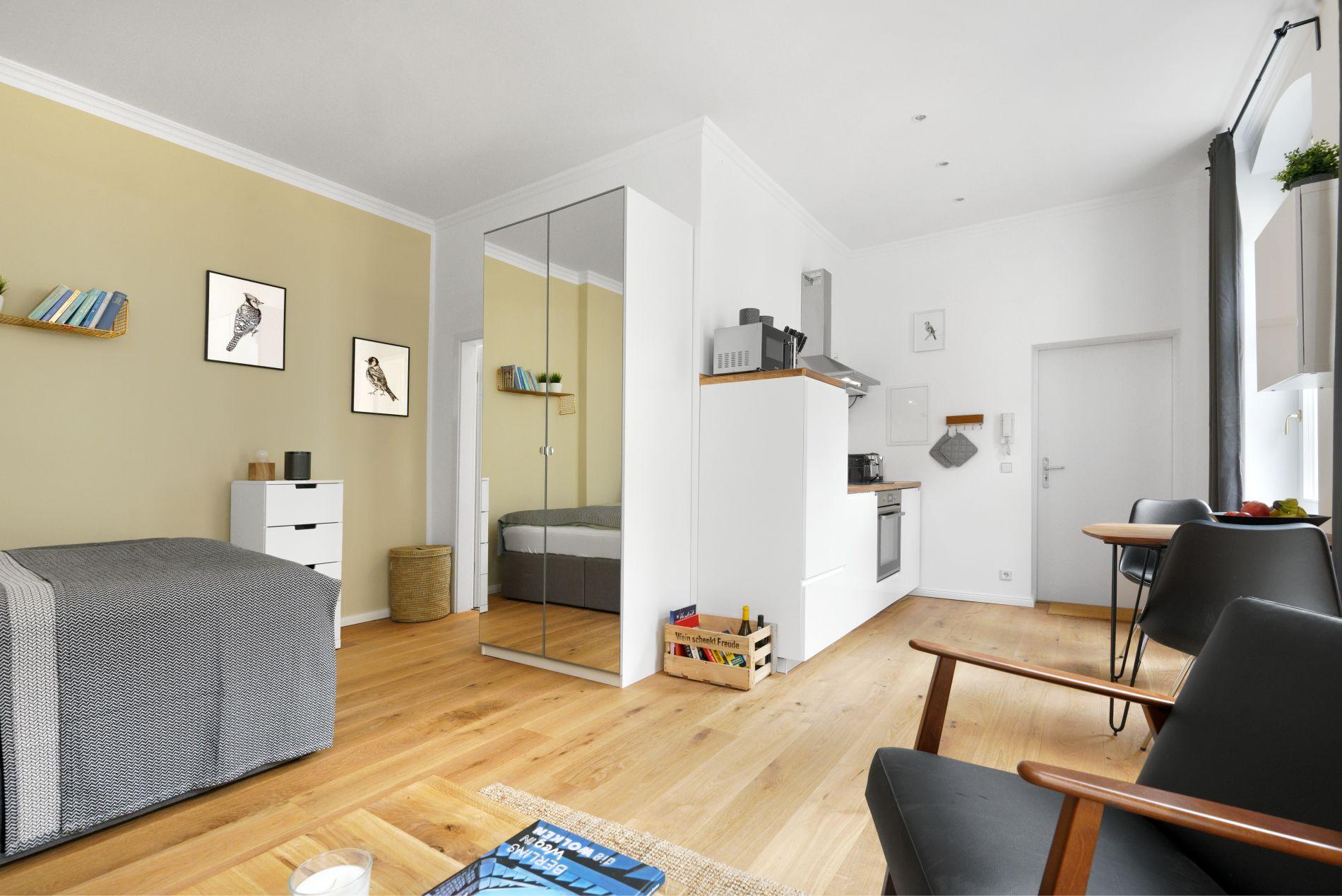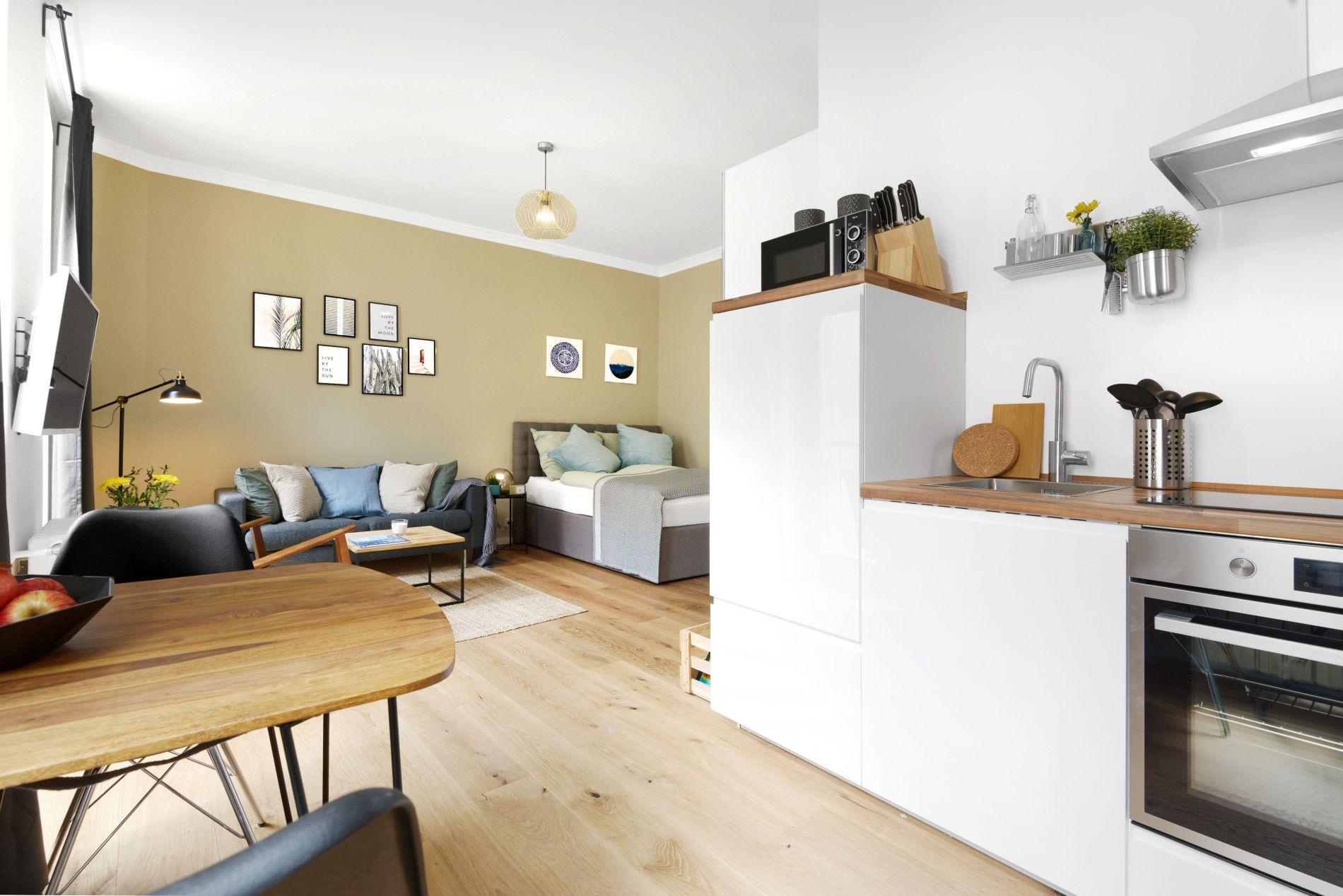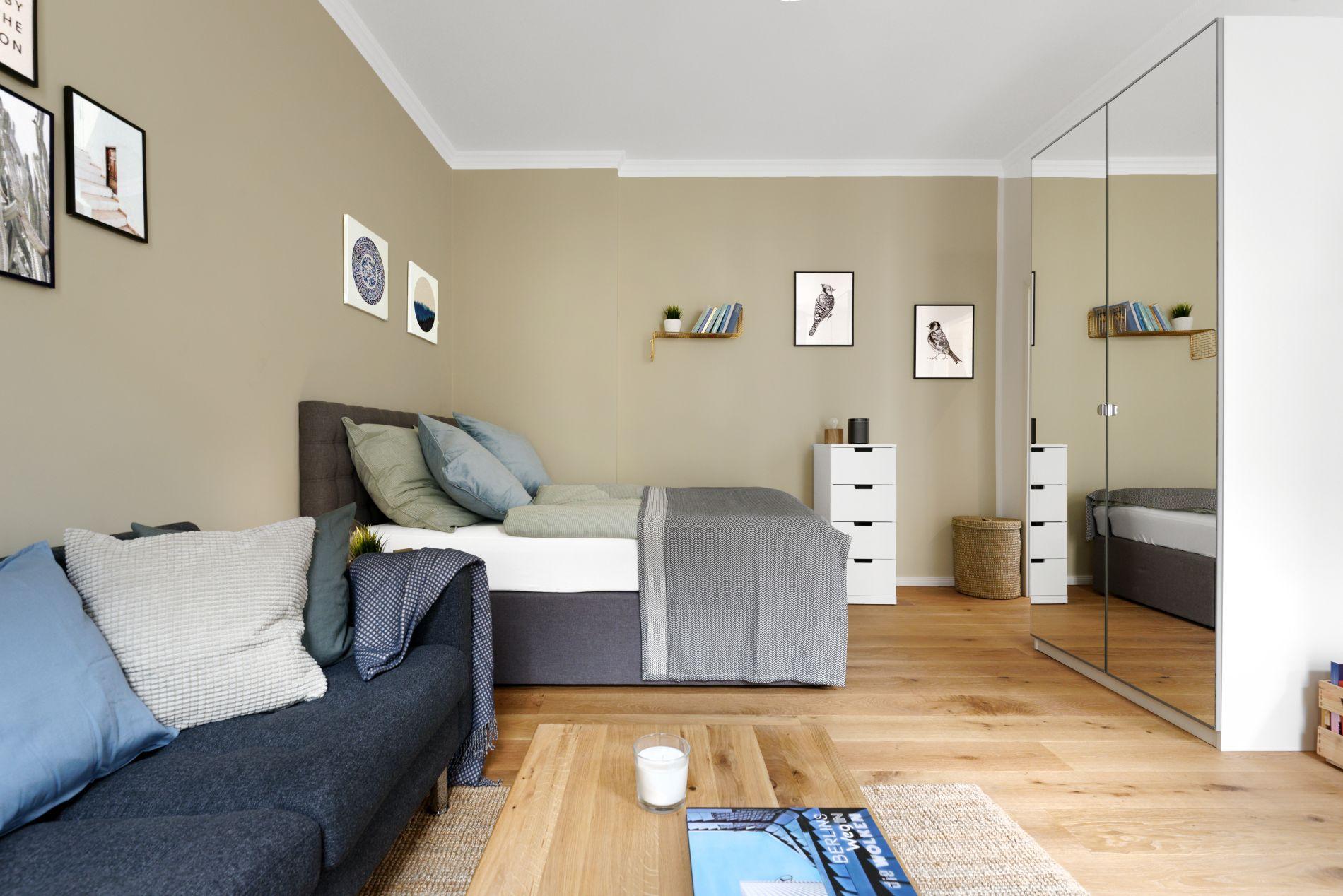 Das wundervoll helle und effizient möblierte 1-Zimmer Apartment (Größe: 40 qm) mit komfortablen Kingsize Boxspring Bett . Das Badezimmer ist mit einer großen begehbaren Dusche ausgestattet . Die gesamte Wohnung wurde in einem modernen, sowie gemütlichen Stil eingerichtet . Die offene und voll ausgestattete Wohnküche rundet dieses Premium-Apartment ab. Neues Mobiliar.