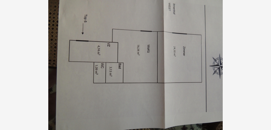 Die Wohnung besteht aus einen Vorzimmer, einer Wohnküche (ca 16,5 m2) mit: Küchenzeile, Kühlschrank, Gasherd mit E-Backrohr und Dunstabzug, Geschirrspüler, Spüle und einem Zimmer mit (24,3 m2), einem Badezimmer mit Wanne und einem separaten WC.