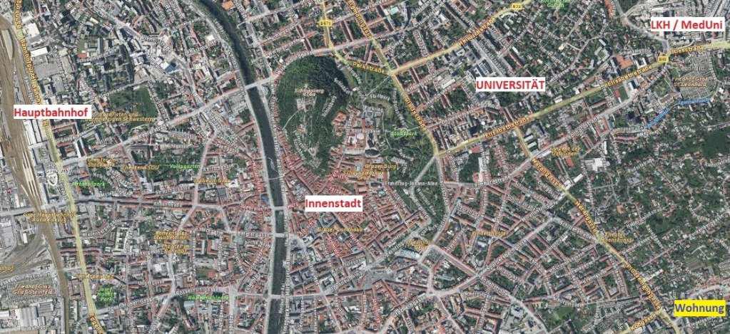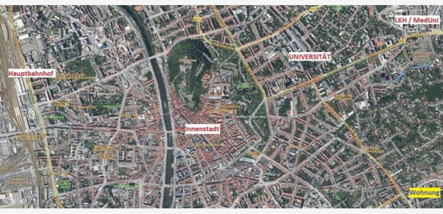 Die Wohnung befindet sich im Stadtteil St. Peter in der Dr.-Georg-Graf-Straße 14 in der steirischen Landeshauptstadt Graz. In der Nähe befindet sich eine notwendige und umfangreiche Infrastruktur mit Cafés, Gasthäusern, Einkaufsmöglichkeiten, Friseur, Ärzte, Tierarzt, Kindergarten, Volksschule, Park etc. Technische Universität und Krankenhaus sind sehr gut erreichbar.
