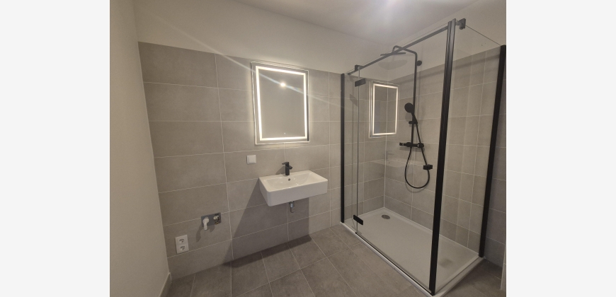 + geräumiges Badezimmer mit verglaster Duschkabine mit Glaswand; Waschbecken mit separat beleuchtetem Spiegel und Hansgrohe Armaturen
