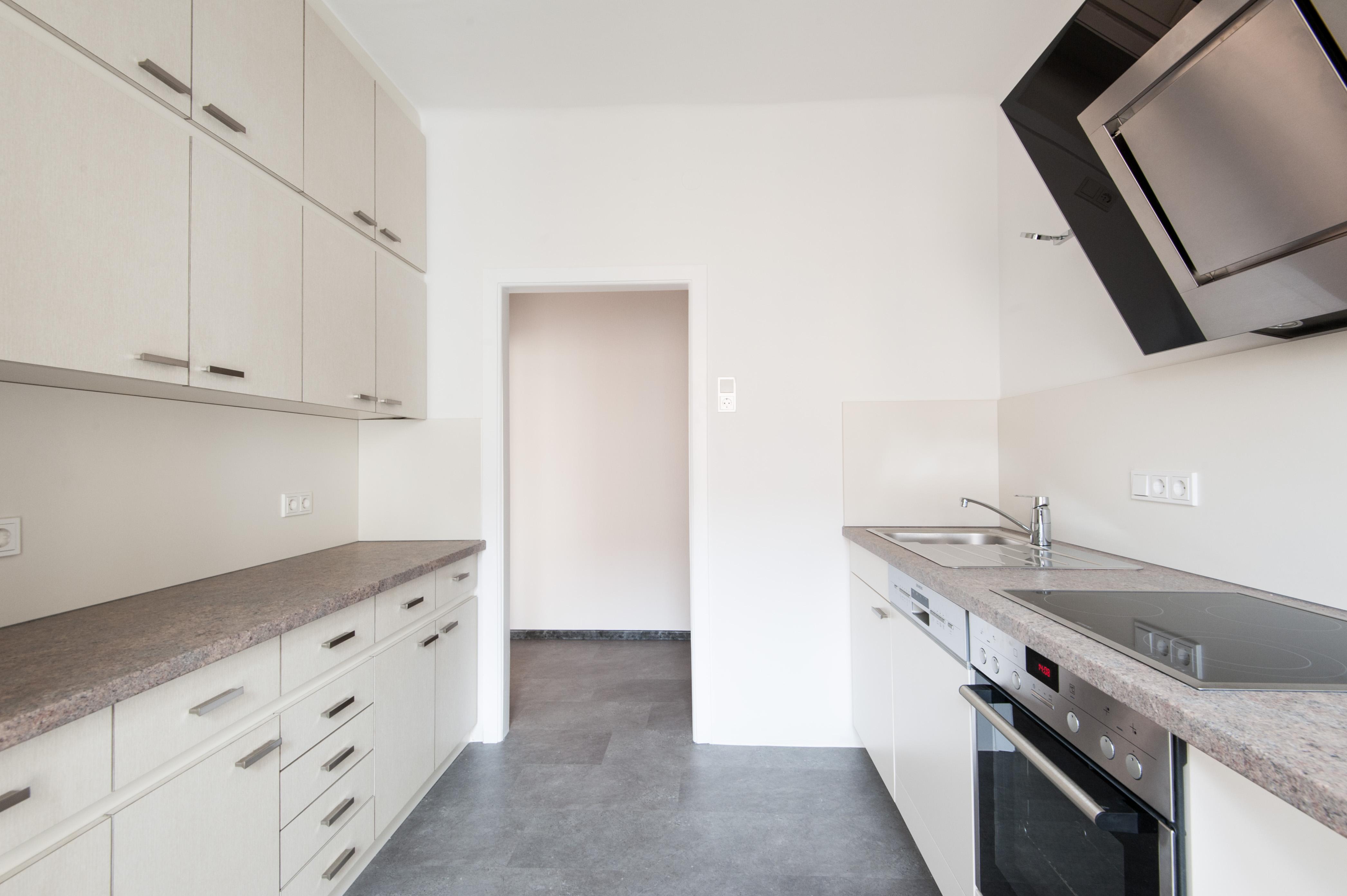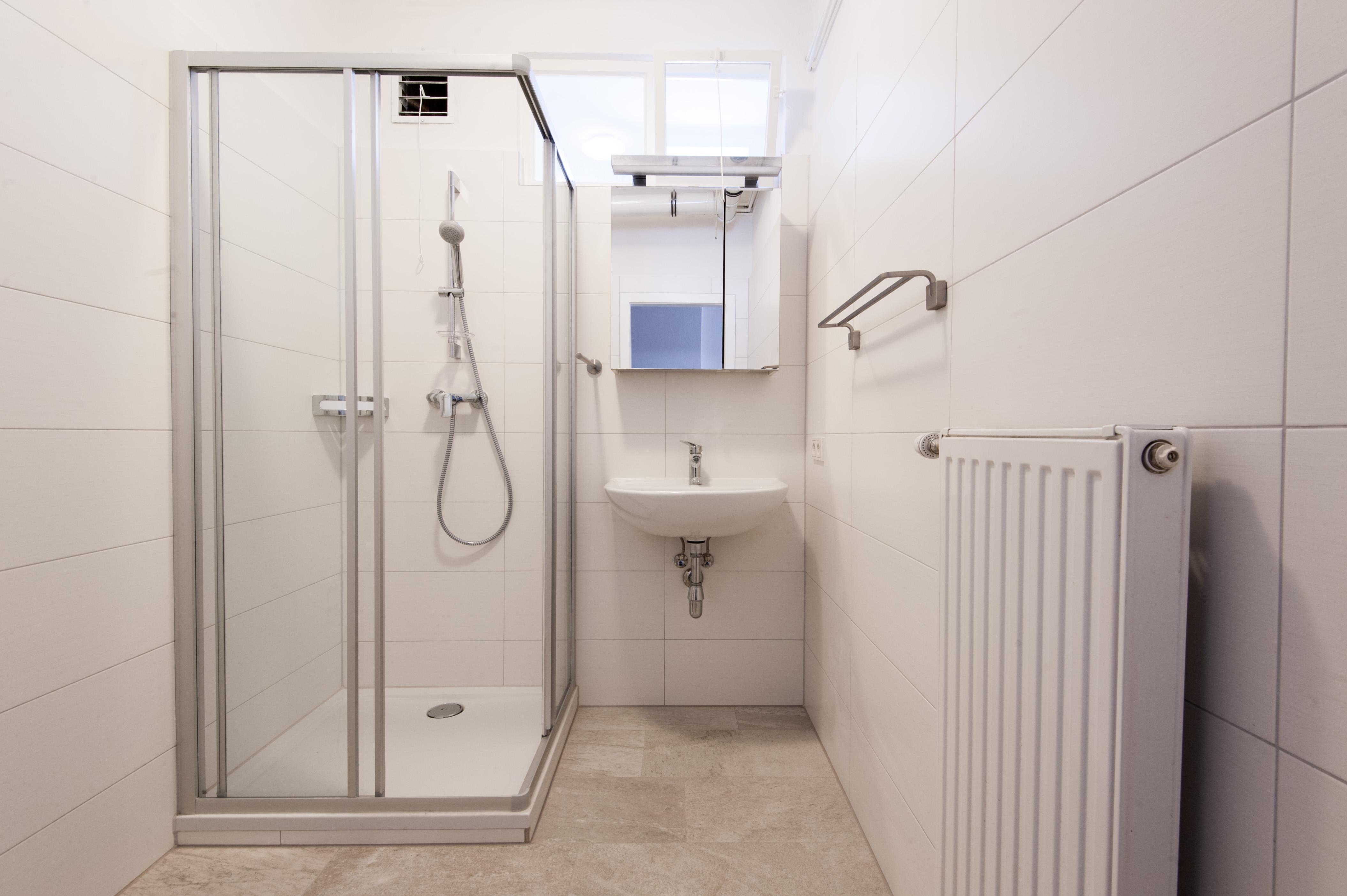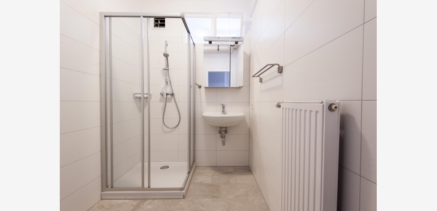 Die Küche ist mit E-Geräten ausgestattet. Das Badezimmer mit Dusche verfügt über einen Waschmaschinenanschluss und bietet Platz für einen Wäschetrockner.