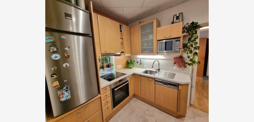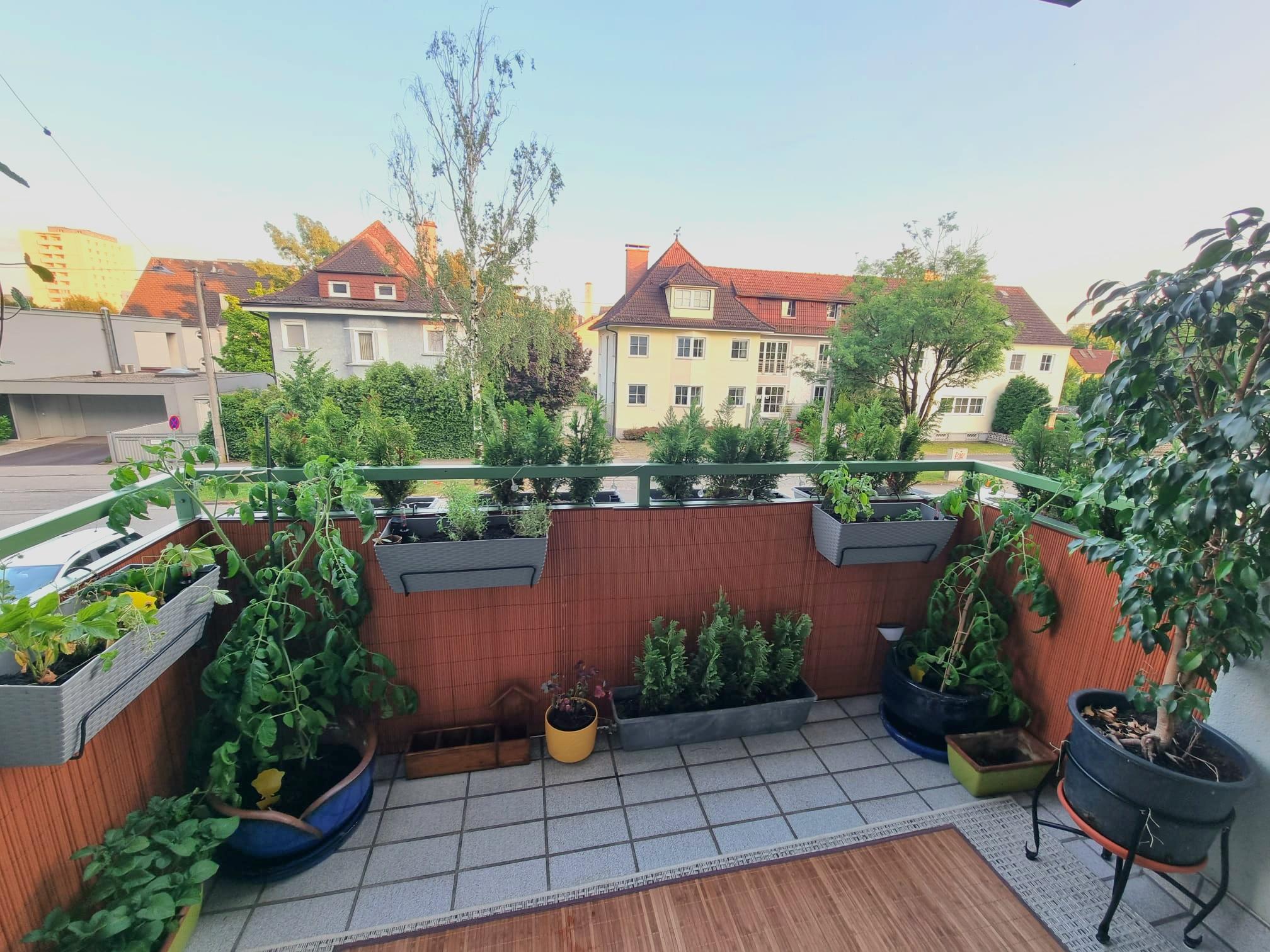 Der Balkon ist sowohl über die Küche als auch das Wohnzimmer begehbar und verfügt über eine Speis und eine elektrische Beschattung.