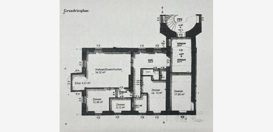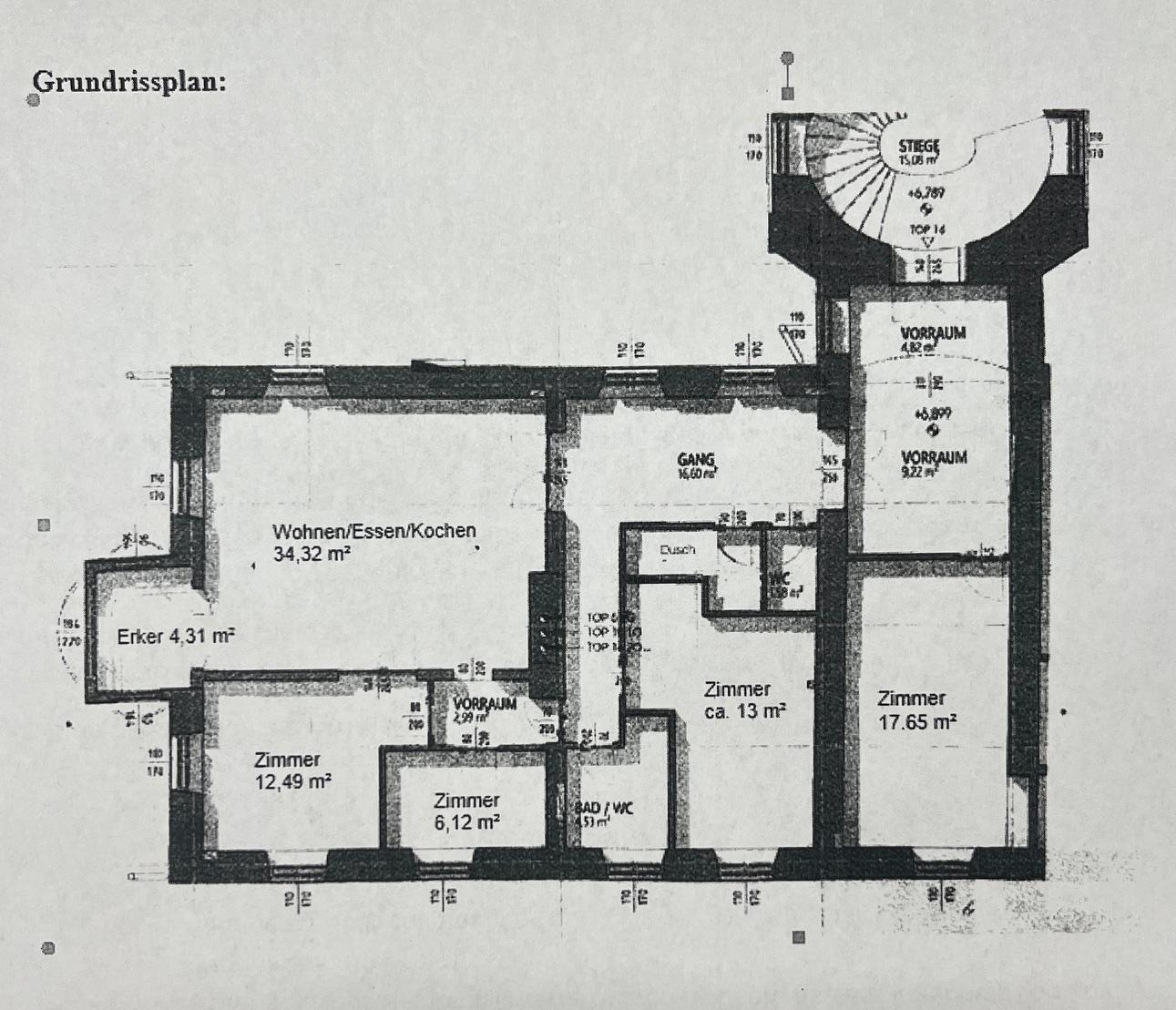 Raumteilung: Wohnen/Kochen/Essen, Erker, vier Zimmer, Bad/WC, Dusche, WC, Vorraum/Gang