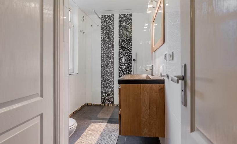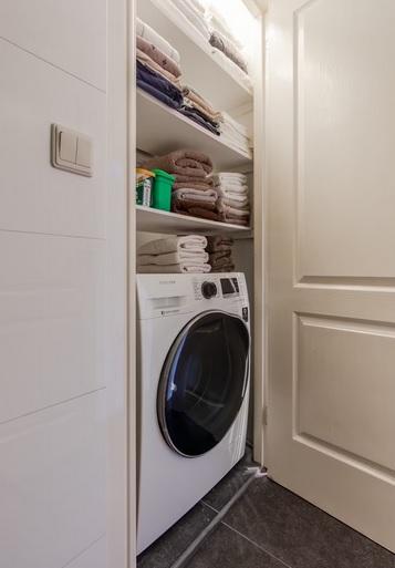 • Badezimmer mit Dusche, Waschmaschine/Trockner, Waschbecken, Toilette