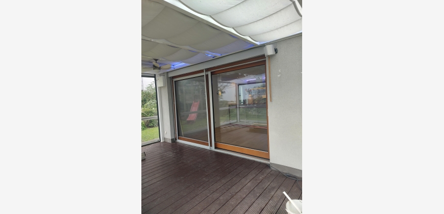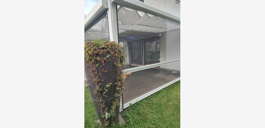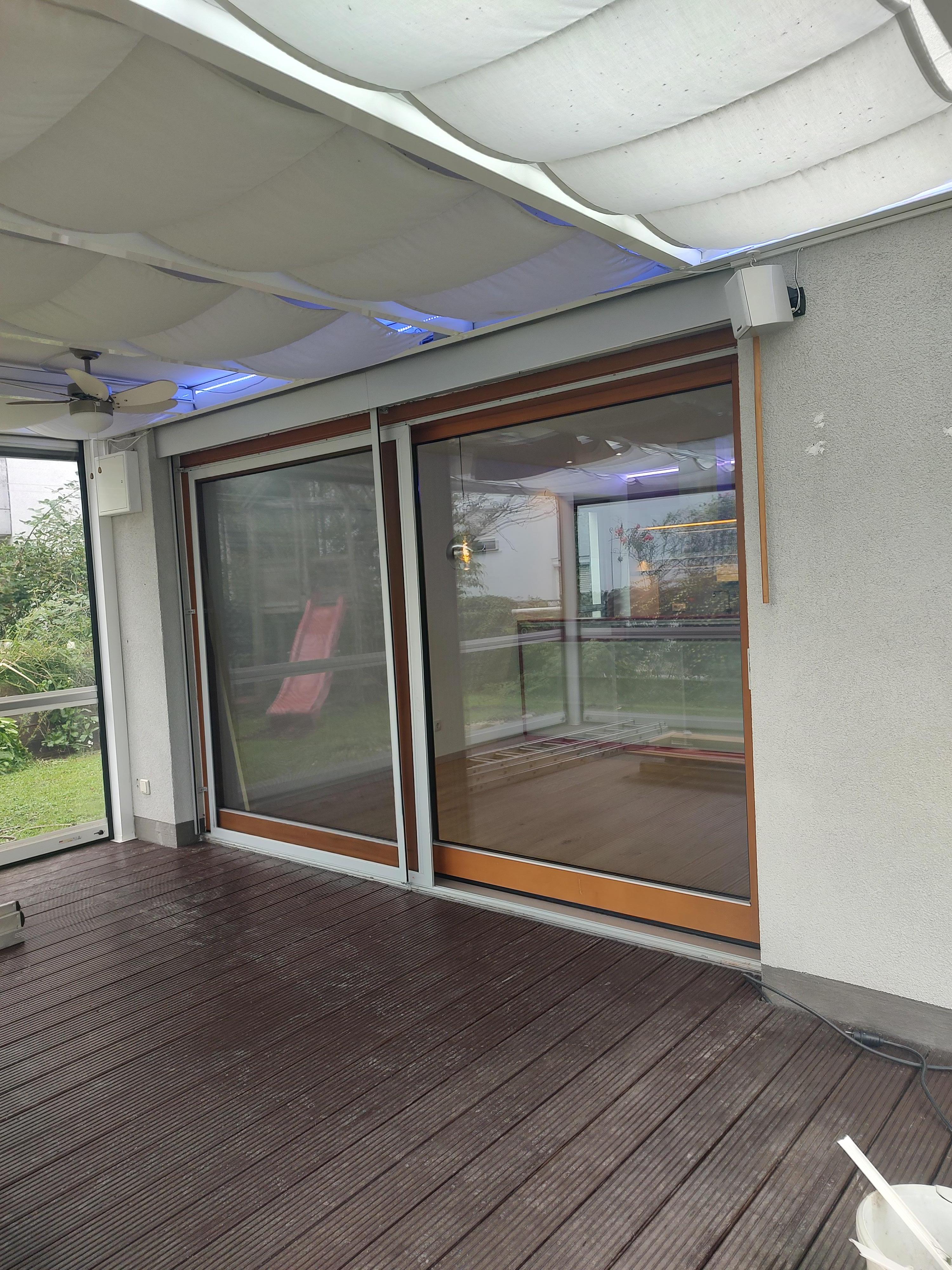 • Überdachte Terrasse (ca. 20 m²) mit Glasdach, verstellbarem Sonnenschutz, elektrischen Rollfenstern (Windschutzrollläden), dimmbarer Beleuchtung & Deckenlicht, sowie ventilator – ganzjährig nutzbar