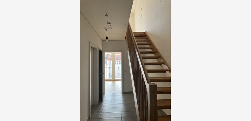 Das Obergeschoss besteht aus einem weiteren Zimmer (12,06m²) und einem großen Wohnraum mit Einbauküche, Festnetzanschluss und Zugang zur zweiten Loggia.