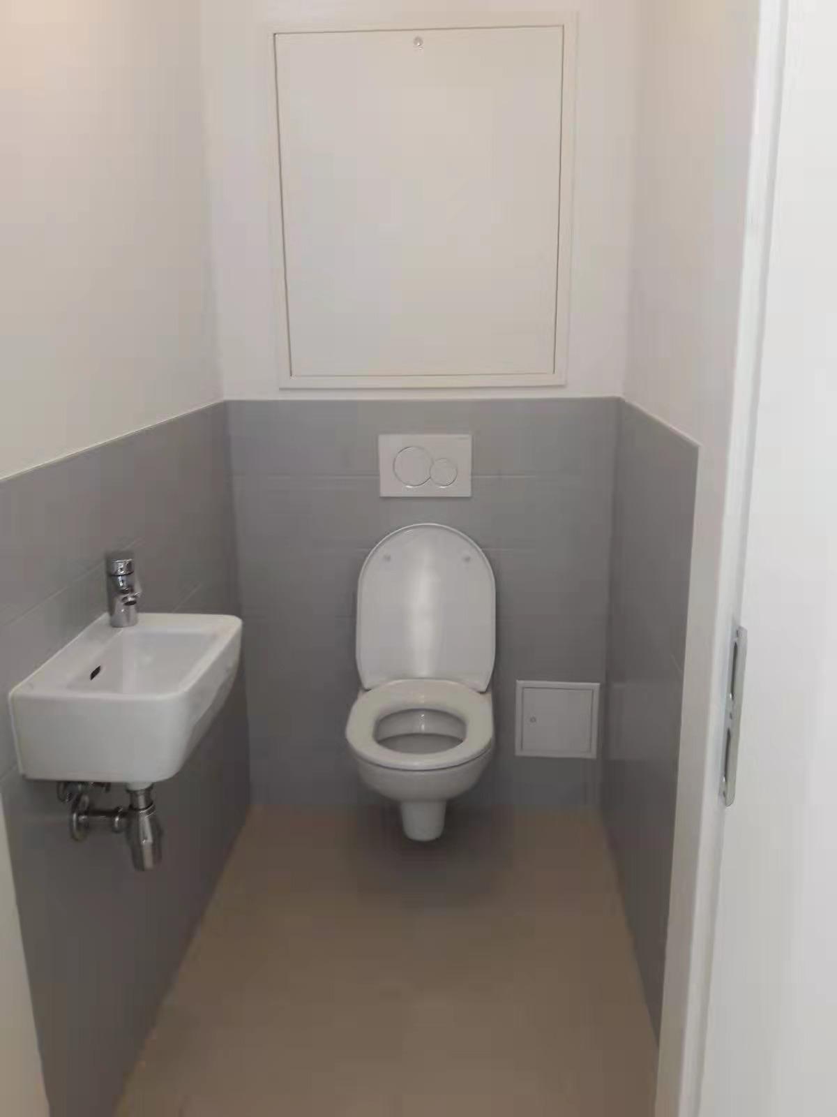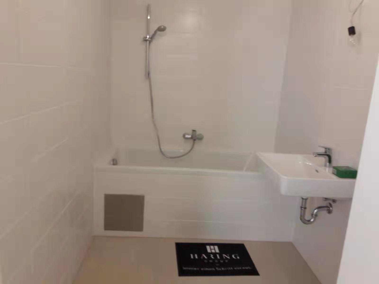 Im Badezimmer befinden sich ein Waschbecken, ein Waschmaschinenanschluss und eine Badewanne. Die Toilette ist separat und verfügt über ein Handwaschbecken.