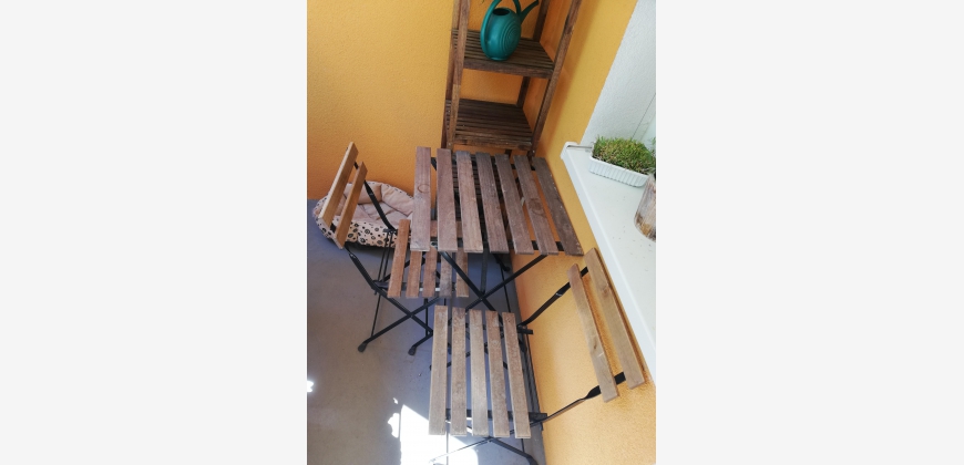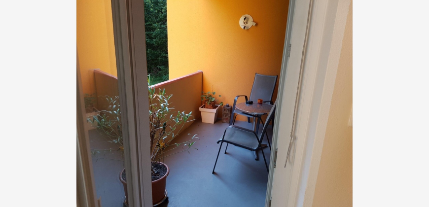 Sie verfügt über eine Essküche, ein großes Wohnzimmer, ein Schlafzimmer, einen Abstellraum, ein Bad mit Wanne und ein separates WC. Sowohl vom Wohn- als auch vom Schlafzimmer gelangt man auf den Balkon, von dem aus man Ausblick auf eine Wiese und den angrenzenden Wald hat. Der Balkon bietet Platz für eine Sitzgruppe und einen Wäscheständer. Bad und Küche haben Fenster Richtung Siedlung, das sehr helle Wohnzimmer und das Schlafzimmer Richtung Wald. Im WC gibt's eine Lüftung. Die Wohnung liegt zwar im Erdgeschoss, aber dennoch nicht ebenerdig. Im Haus gibt es nur sechs Parteien. Die NachbarInnen sind sehr nett und ruhig.
