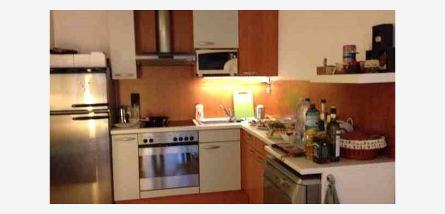 Vorraum mit Treppen zur Wohnfläche, exklusiver großer Wohnraum mit offener Einbau-Küche und SW Balkon (7m2), ein Schlafzimmer, Wannenbad mit Dusche und Waschbecken