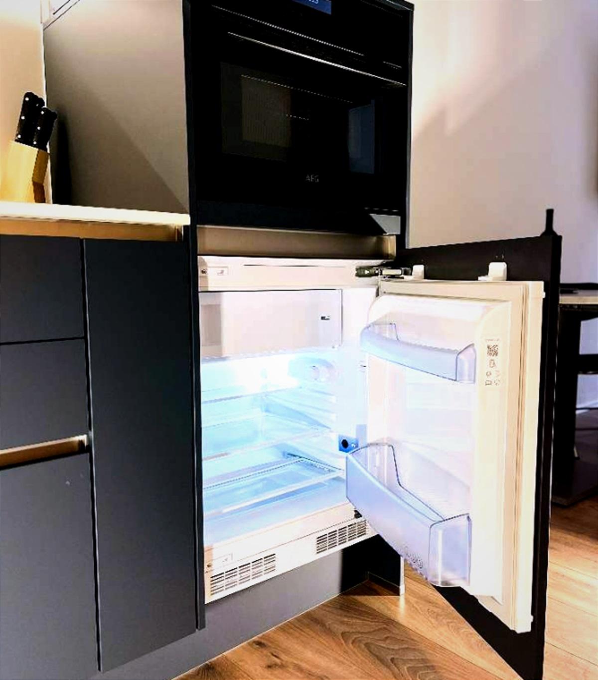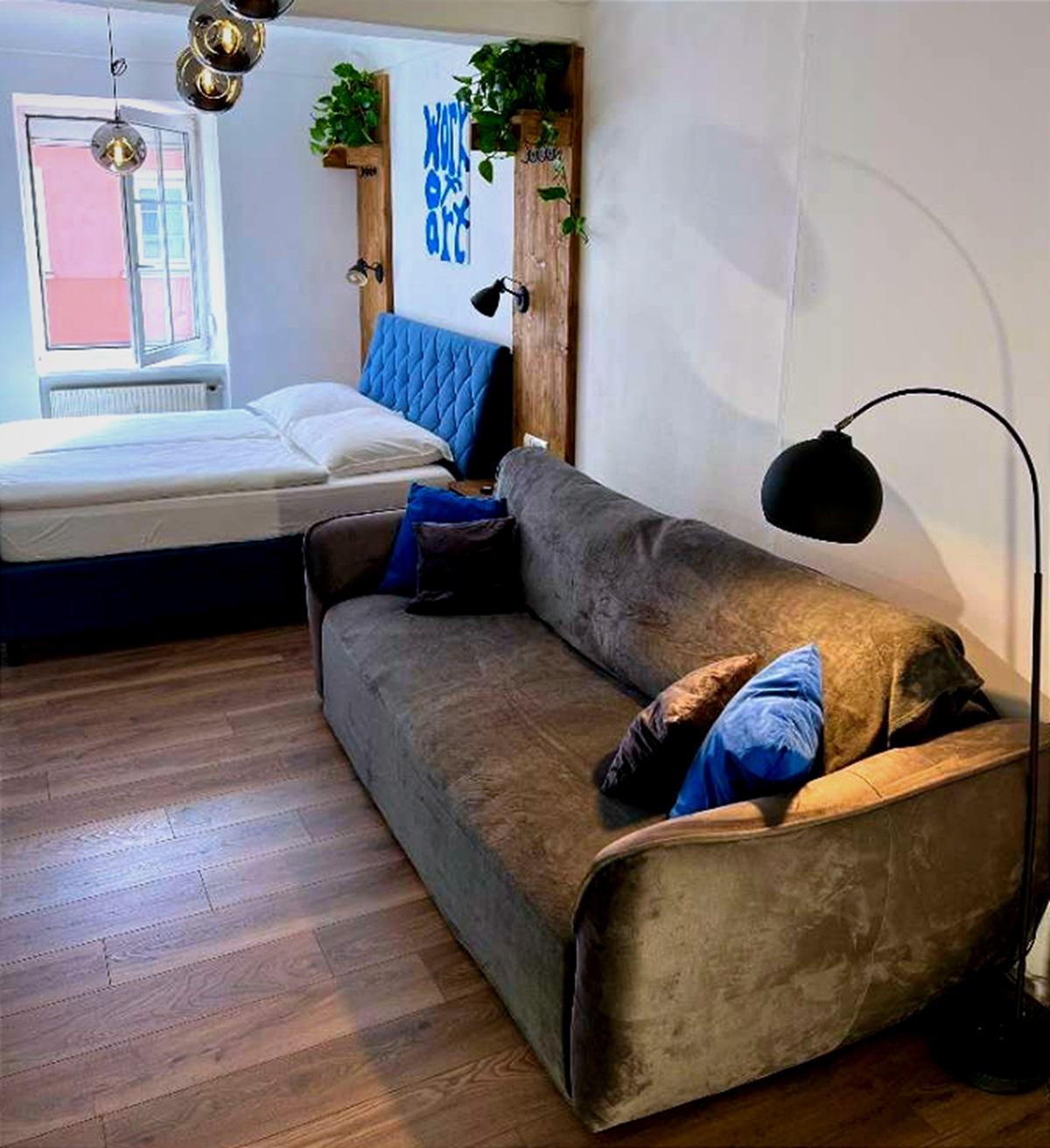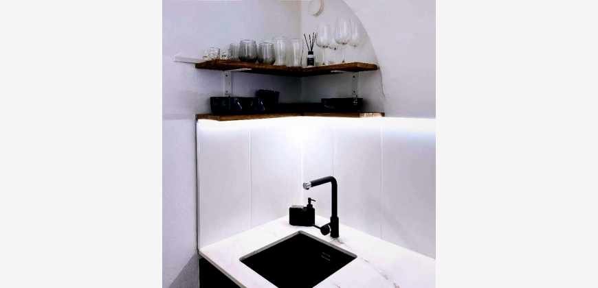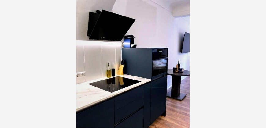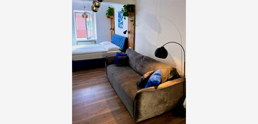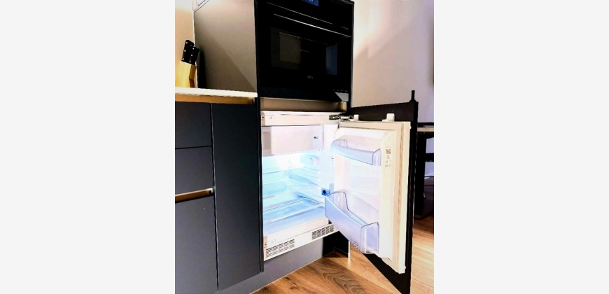Die Wohnung verfügt über einen großzügigen Vorraum, ein modern gestaltetes, verblendetes Wandregal, ein Badezimmer sowie einen offen gestalteten Wohn- und Schlafbereich, der funktional und zugleich gemütlich eingerichtet ist. Die moderne und vollständig ausgestattete Küche bietet alles, was für den täglichen Gebrauch benötigt wird. Ein großformatiger Fernseher sowie eine angenehme Wohnatmosphäre sorgen für zusätzlichen Komfort.