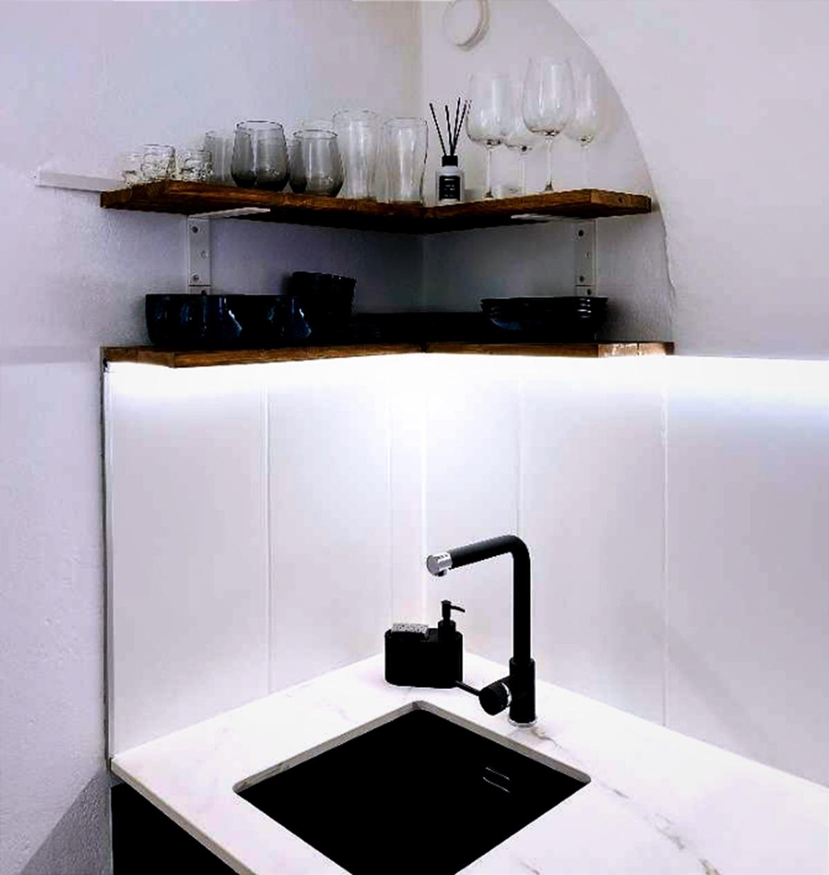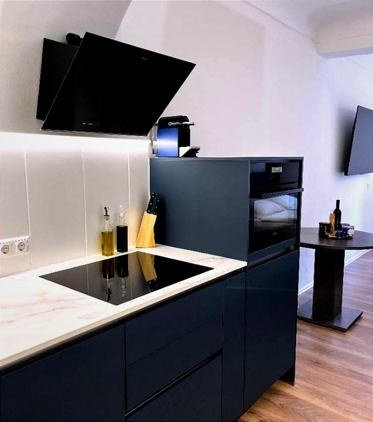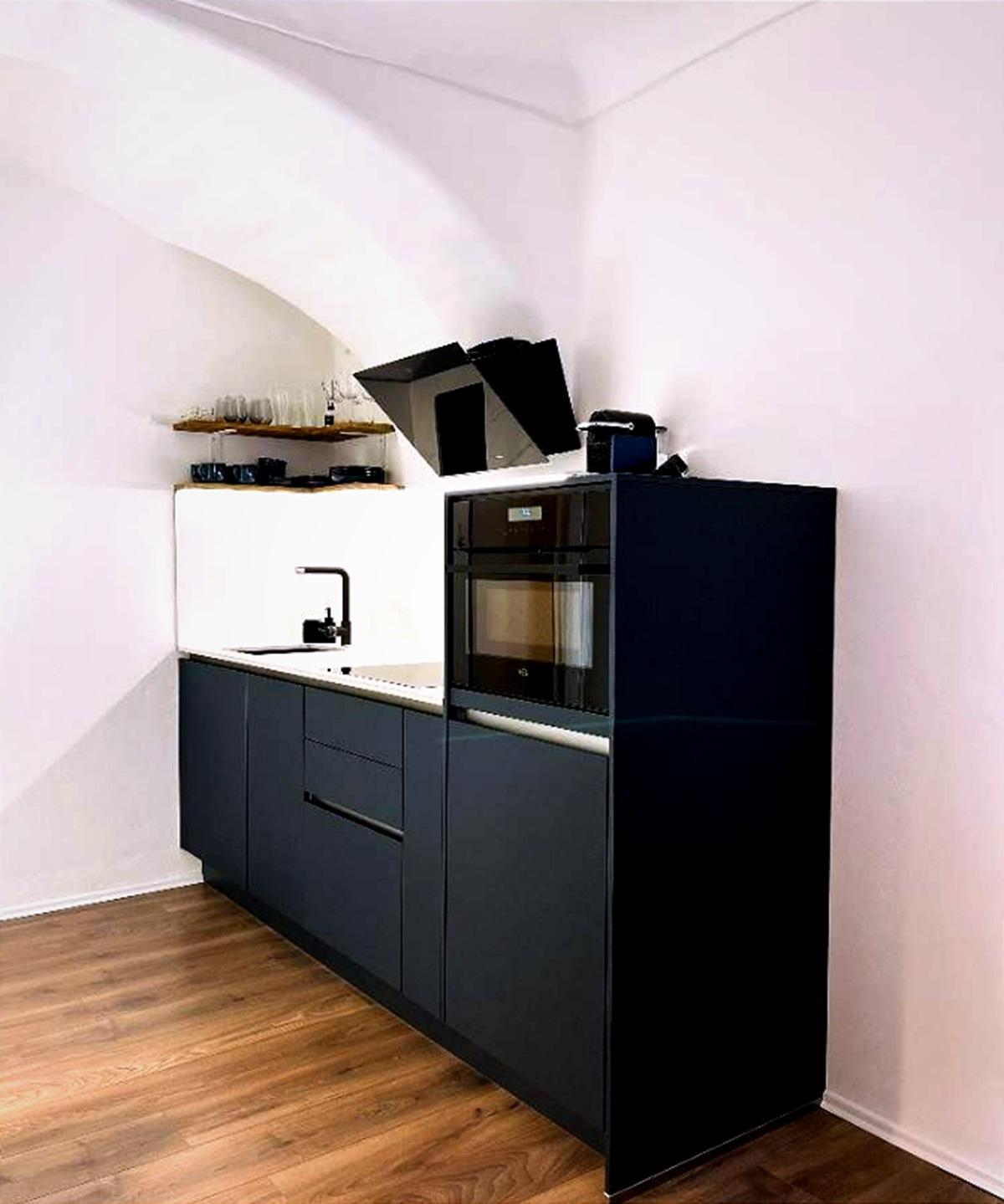 Die Wohnung verfügt über einen großzügigen Vorraum, ein modern gestaltetes, verblendetes Wandregal, ein Badezimmer sowie einen offen gestalteten Wohn- und Schlafbereich, der funktional und zugleich gemütlich eingerichtet ist. Die moderne und vollständig ausgestattete Küche bietet alles, was für den täglichen Gebrauch benötigt wird. Ein großformatiger Fernseher sowie eine angenehme Wohnatmosphäre sorgen für zusätzlichen Komfort.