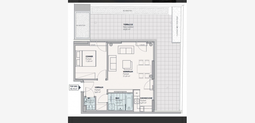 Wohnung besteht aus 2 Zimmern mit Kochecke (49qm) und einer einmaligen Terrase von 40qm mit einem Blick über ganz Wien.