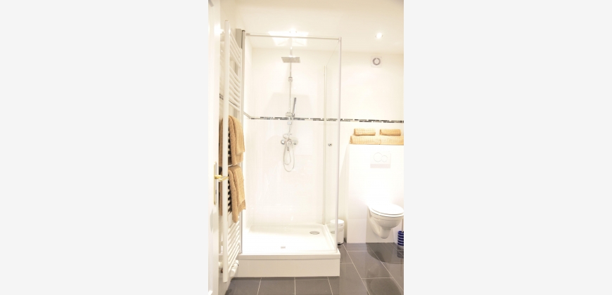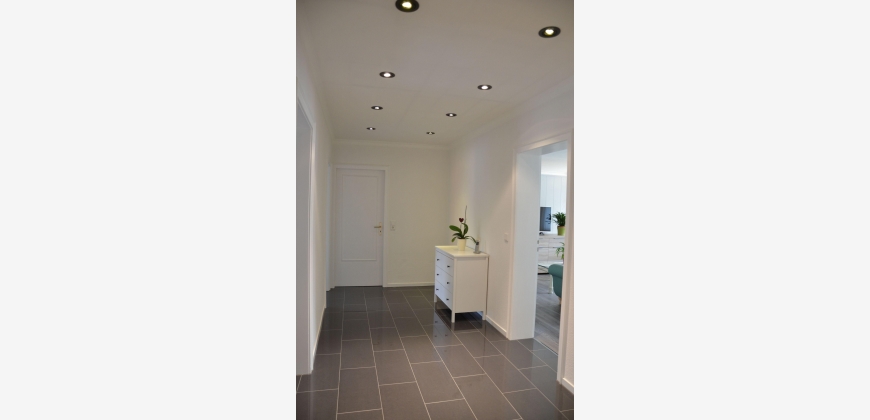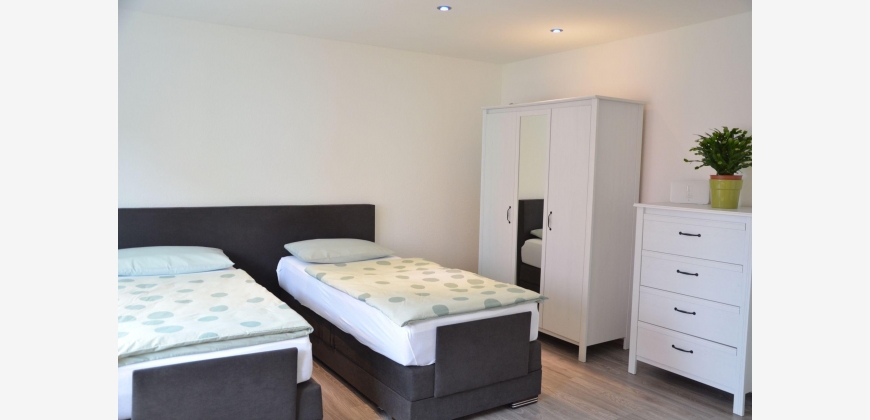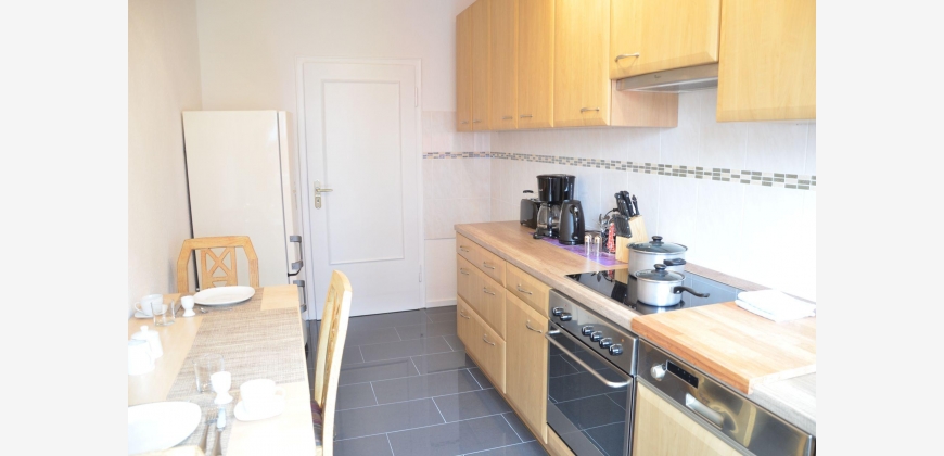 Sie betreten die ca. 45 qm große, 1-4 Personen Wohnung über die großzügige Diele, von der aus Sie alle weiteren Räume erreichen. Die Küche ist hochwertig ausgestattet. Hier finden Sie Elektrogeräten wie Herd mit Ceranfeld und Backofen auch eine Mikrowelle, Wasserkocher, Toaster, Kaffeemaschine, Töpfe u. Pfannen. Geschirr wie auch Gläser und Besteck vervollständigen die Utensilien. Ein großzügiger Kühlschrank im Retrostil mit Gefrierfach ist ebenfalls vorhanden. Die Küche wird durch einen geräumigen Esstisch mit Stühlen vervollständigt. Im Wohnzimmer erwartet Sie ein großzügiger heller Raum mit einer breiten Fensterfront.