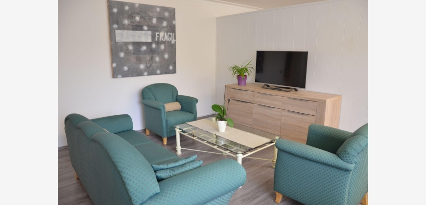 Das geschmackvolle Ambiente mit Sofa, Schrank, Fernseher und Sideboard lädt zum verweilen ein.