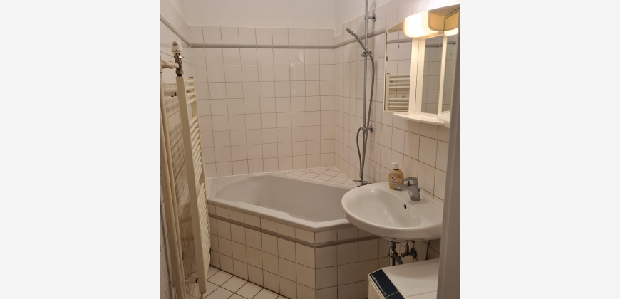 Aufteilung: Flur mit fliesenboden und fußmatte. Separates WC, Bad mit eck-Badewanne und kleiner Waschmaschine. Küche mit kühl-gefrierkombi, Mikrowelle, miele Backofen und induktions Platte. Abstellraum. Schlafzimmer und großes Wohnzimmer mit blick in den Gemeinschaftsgarten.