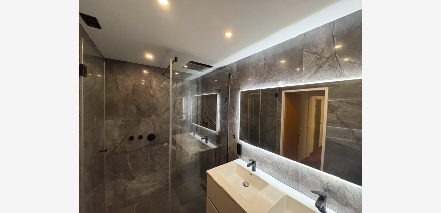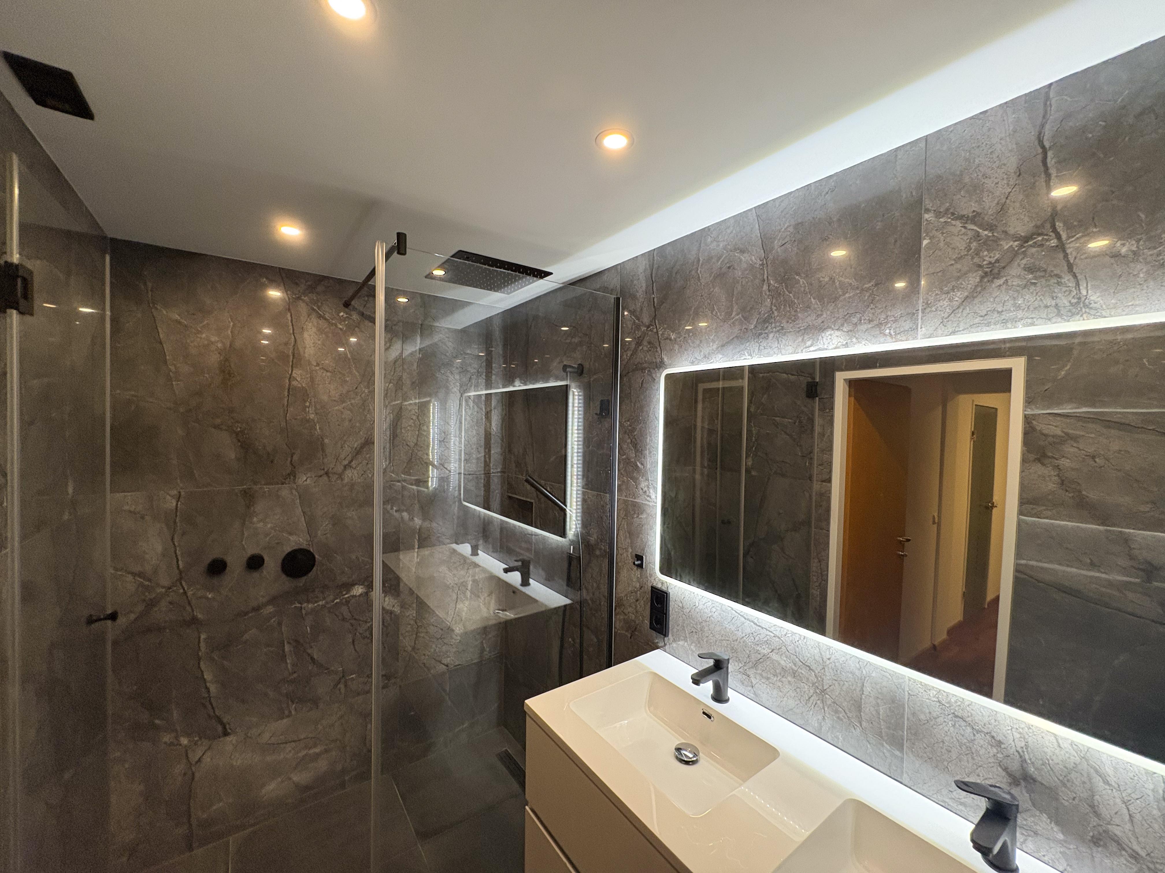 • Renoviertes Badezimmer (Walk-In-Dusche | Doppelwaschbecken | großer, umlaufend beleuchteter Spiegel | integrierter Bluetooth-Lautsprecher)