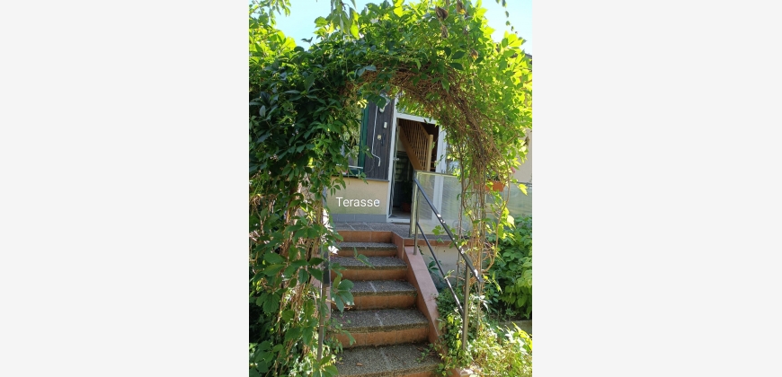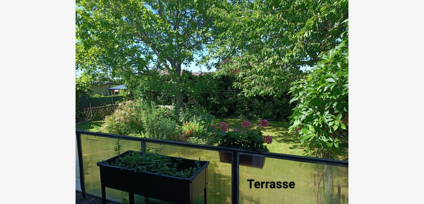 Idyllischer Garten mit Altbaumbestand, Pergola, einem Carport mit einer Werkbank, Schuppen für Gartengeräte sowie eine Garage. Ein besonderes Plus ist ein alter sehr ertragreicher Feigenbaum am Eingang.