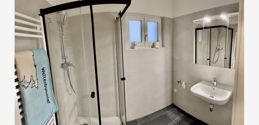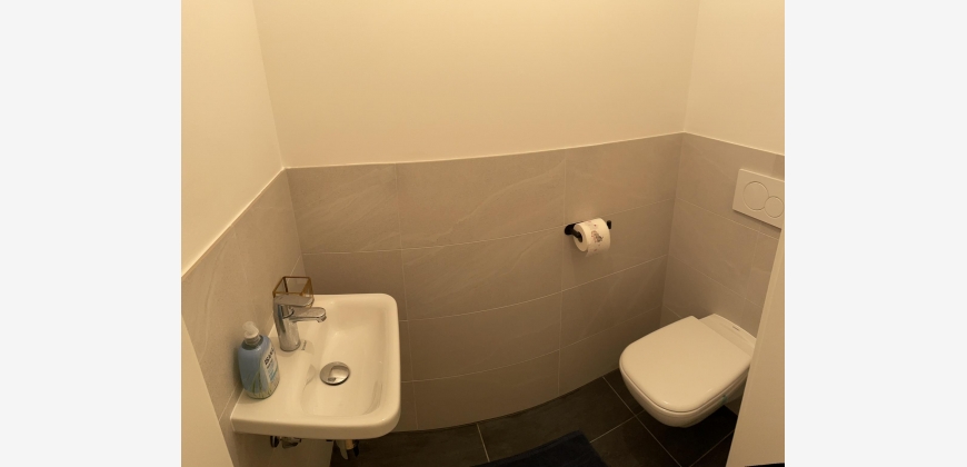 Ein separates WC im Eingangsbereich mit eigenem Waschbecken sorgt für Privatsphäre und erlaubt lange entspannte Stunden im Bad, welches über eine moderne Dusche, einem geräumigen Spiegelschrank sowie zwei Fenstern und somit auch über Tageslicht verfügt. Ein Anschluss für eine Waschmaschine steht bereit.
