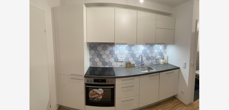 Vom Vorzimmer aus gelangen Sie in die moderne, voll ausgestattete Wohnküche (inkl. Geräte), welche sowohl Platz für eine Essgelegenheit als auch für eine Sofaecke bietet.