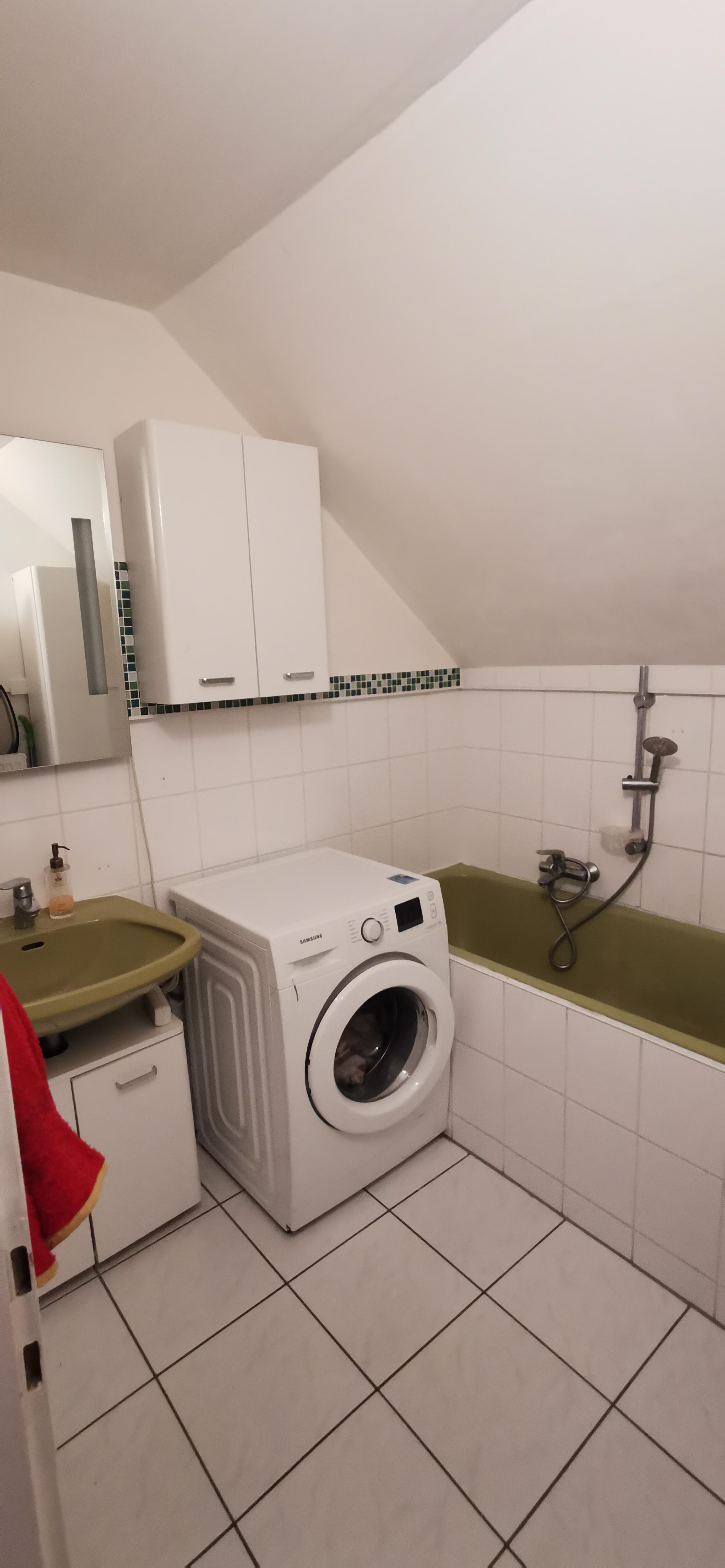 1 Badezimmer mit Badewanne und Waschmaschine von Samsung