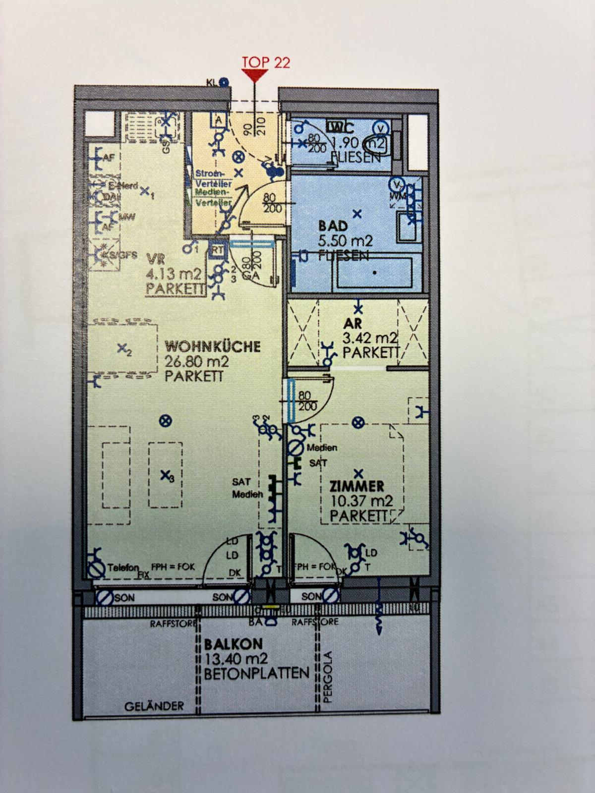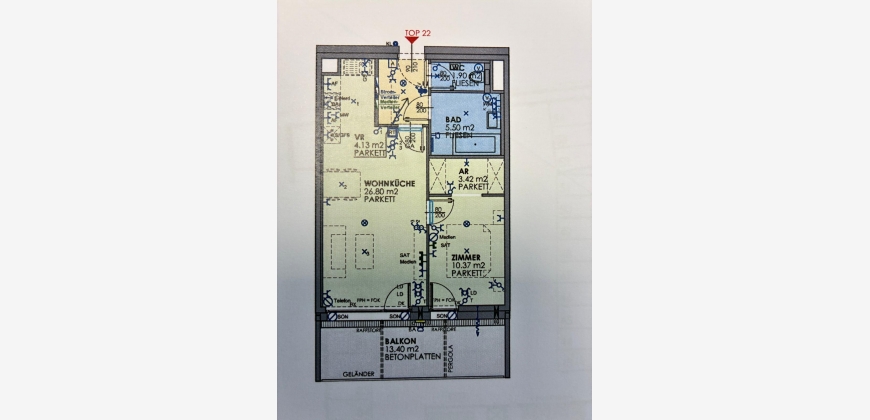 Moderne Dachgeschosswohnung mit 52,25 m² Wohnfläche und einer 13,4 m² großen Terrasse in Wien 1230, Breitenfurterstraße. Die Neubau-Wohnung befindet sich im 7. Stock eines 8-stöckigen Gebäudes und ist ab 01.06.2026 zu mieten. Die monatlichen Kosten betragen 950 € (inkl. Betriebskosten) mit einer Kaution von 2850 €. Die Heizkosten sowie Warmwasser und Kaltwasser werden über die Hausverwaltung abgerechnet. Heizung, Warmwasser und Kaltwasser kosten zusammen ca. 150 Euro pro Monat (bei ca. zwei Personen im Haushalt).
