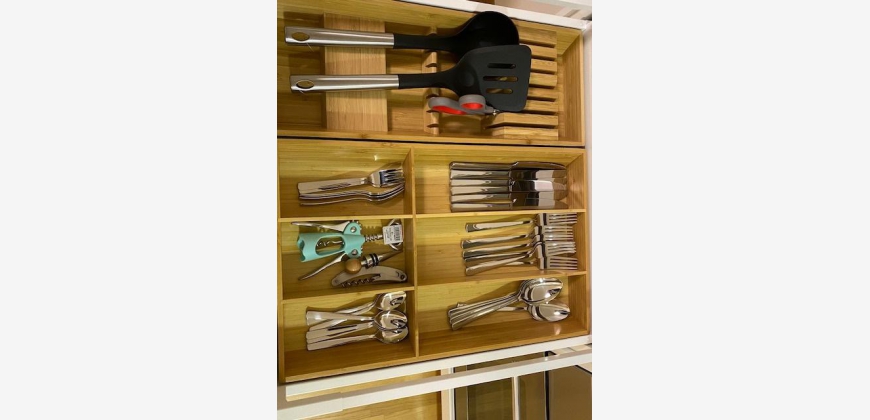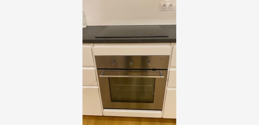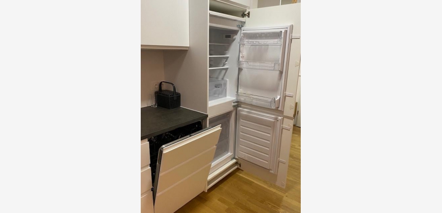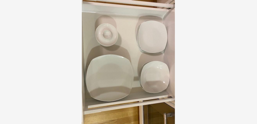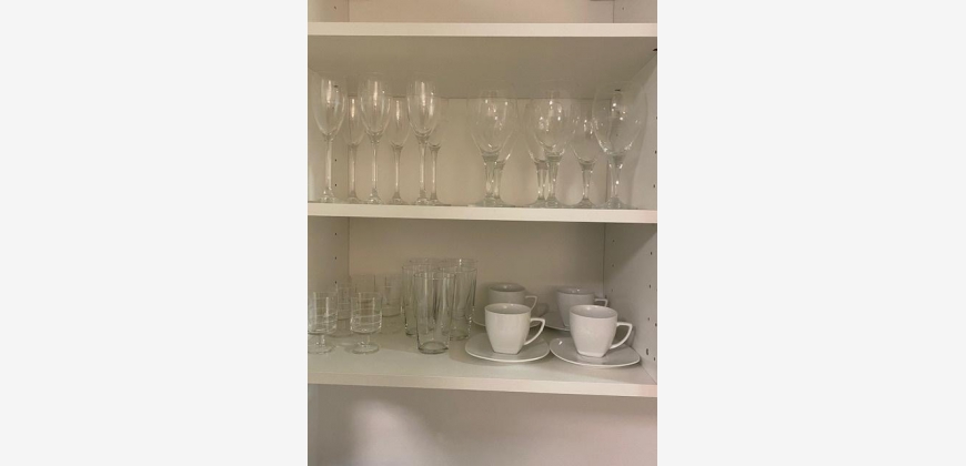Küchenzeile mit Ceran- Kochfeld, Backrohr, Geschirrspüler, Kühl- Gefrierschrank, Koch- und Essgeschirr sowie Weinkühler mit Gläsern.