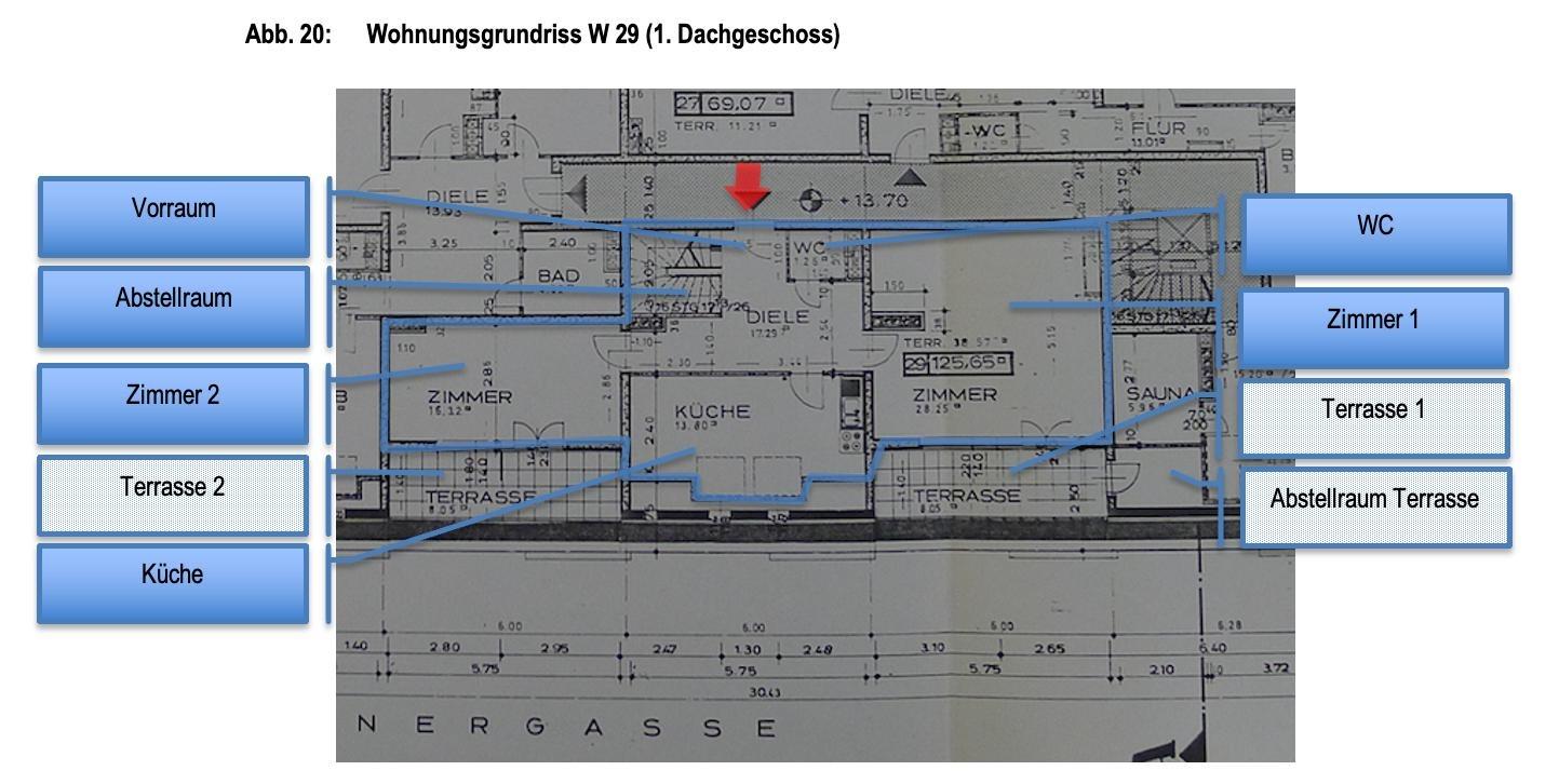 Die Wohnung ist Ost-West seitig ausgerichtet, die ostseitige große Terrasse ist hofseitig, unverbaubar und hat Ausblicke bis zum Stephansdom. Die westseitigen Terrassen blicken in Richtung Wienerwald.